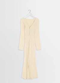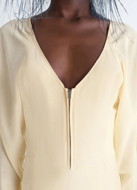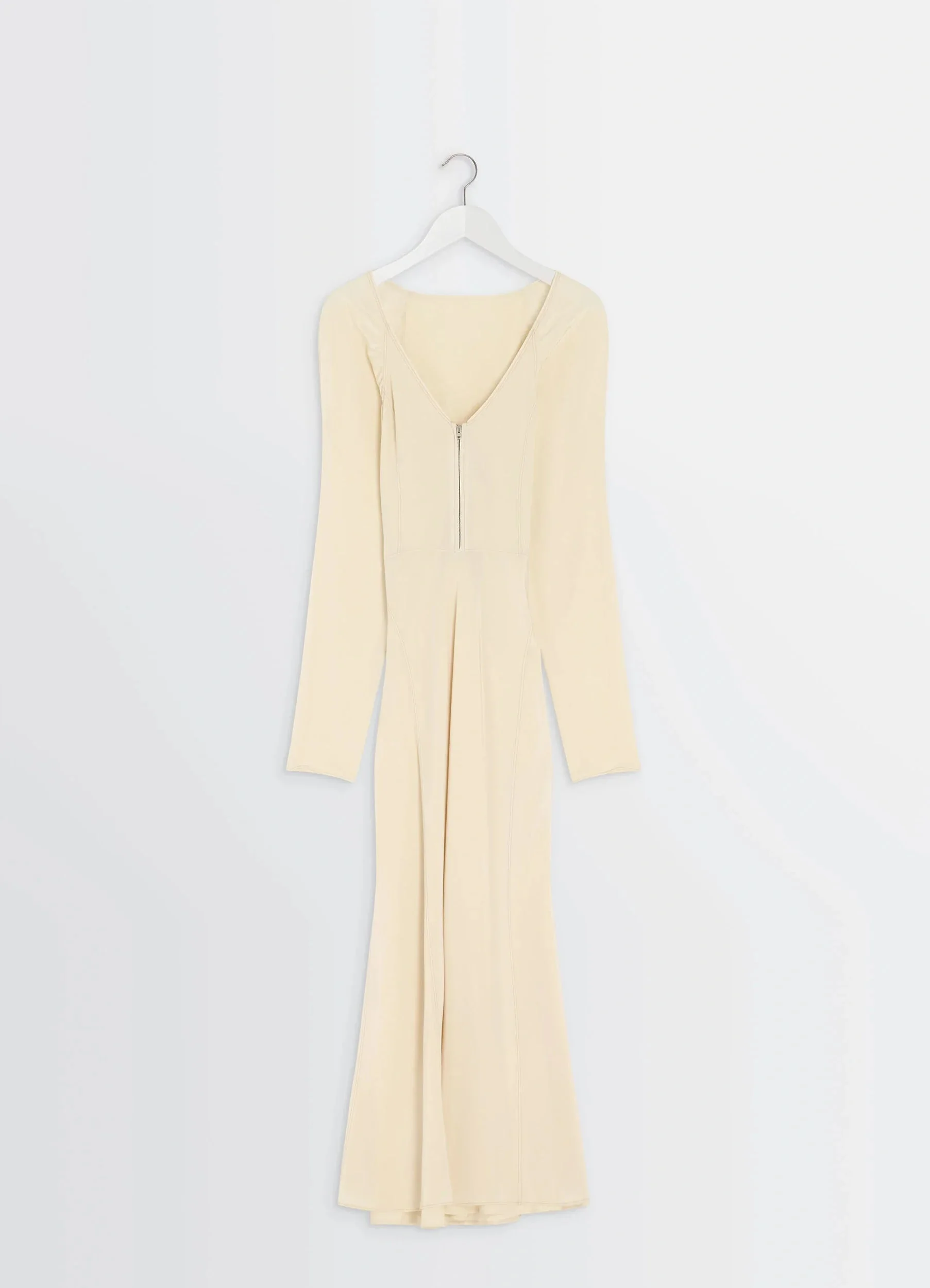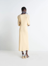 This body-hugging dress features a bias cut creating movement on the skirt section. It's made from silk crepe de Chine, an archetypal fabric for women's wardrobes. The model is 177 cm tall and is wearing a size 36 (S). This body-hugging dress features a bias cut creating movement on the skirt section. It's made from silk crepe de Chine, an archetypal fabric for women's wardrobes. The model is 177 cm tall and is wearing a size 36 (S). DETAILS Bias-cut dress in silk crepe de Chine Fitted cut Midi-length V-neck Long raglan sleeves with front and back gathers Closure with visible metal zipper at the front Skirt with bias-cut panels Invisible side zipper closure Topstitched trim Made in Portugal Style : DR1117 LF1446 Bias-cut dress in silk crepe de Chine Fitted cut Midi-length V-neck Long raglan sleeves with front and back gathers Closure with visible metal zipper at the front Skirt with bias-cut panels Invisible side zipper closure Topstitched trim Made in Portugal Style : DR1117 LF1446 CARE Main Material: 100% Silk Main Lining: 100% Polyester Do not wash Do not bleach Do not tumble dry Cool ironing Soft dry clean Main Material: 100% Silk Main Lining: 100% Polyester Do not wash Do not bleach Do not tumble dry Cool ironing Soft dry clean