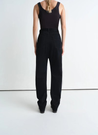These high-waisted denim pants are crafted in heavy indigo denim, a classic LEMAIRE fabric with a thick, round hand, a visible twill weave and a deep black wash. The Dropped Crotch Pants feature a relaxed crotch, blending comfort with a contemporary silhouette. Their tapered leg adds a refined touch, while the yoke at the back enhances the flattering fit and lasting structure. Designed in a classic five-pocket style, these pants use the versatile denim vocabulary, making them a true wardrobe staple. DETAILS - Regular fit - High-waisted - Relaxed crotch - Tapered leg - Five pockets Made in Morocco Style: PA1199 LD068 FABRICS & CARE Main Fabric: 100% Cotton Main Lining: 100% Cotton Soft wash 30° Do not bleach Do not tumble dry Cool ironing Soft dry clean Wash upside down