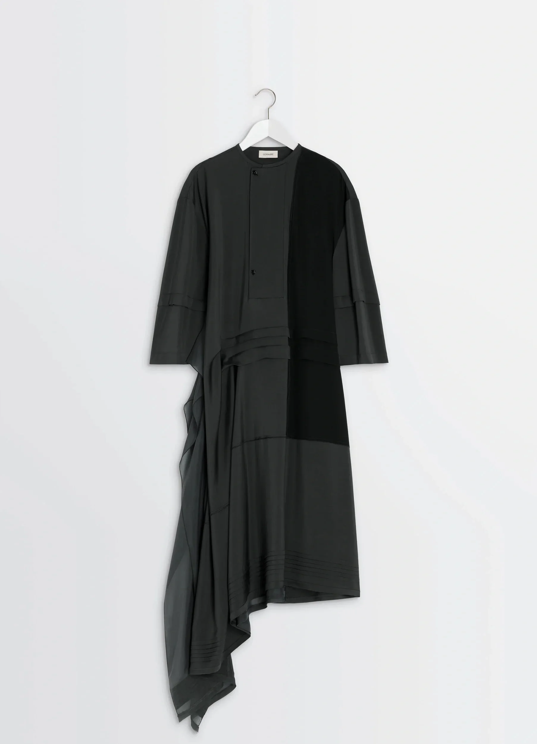 This midi dress is crafted in a patchwork of crepe de Chine, parachute silk chiffon, and a silk twill blend. Inspired by the 1920s, this piece features an asymmetrical cut with many sophisticated details, such as pleats and satin-stitch finishing. The model is 177 cm and is wearing a size 36 (S). This midi dress is crafted in a patchwork of crepe de Chine, parachute silk chiffon, and a silk twill blend. Inspired by the 1920s, this piece features an asymmetrical cut with many sophisticated details, such as pleats and satin-stitch finishing. The model is 177 cm and is wearing a size 36 (S). DETAILS Dress in patchwork of fabrics including crepe de Chine and parachute silk chiffon Oversized cut Midi-length Lightweight unlined model Crewneck Buttoned closure Three-quarter sleeves Blind tucks Panels finished with satin stitching Draped side panels Asymmetrical hem with side slit Made in Portugal Style : DR1118 LF1472 Dress in patchwork of fabrics including crepe de Chine and parachute silk chiffon Oversized cut Midi-length Lightweight unlined model Crewneck Buttoned closure Three-quarter sleeves Blind tucks Panels finished with satin stitching Draped side panels Asymmetrical hem with side slit Made in Portugal Style : DR1118 LF1472 CARE Main Material: 73% Viscose 23% Silk 4% Elasthanne Second Material: 100% Silk Third Material: 100% Silk Do not wash Do not bleach Do not tumble dry Cool ironing Soft dry clean Main Material: 73% Viscose 23% Silk 4% Elasthanne Second Material: 100% Silk Third Material: 100% Silk Do not wash Do not bleach Do not tumble dry Cool ironing Soft dry clean