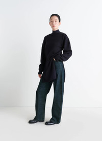These high-waisted pants with their rounded cut are an emblematic piece of the Lemaire wardrobe. They are made from thick denim, a Lemaire wardrobe staple, in a deep indigo wash. The model is 177 cm and is wearing a size 36 (S). DETAILS High waisted pants in heavy indigo denim Curved cut Belt loops at the waistband Closure with hooks, buttons, and hidden zipper Western pockets with a ticket pocket Back patch pockets Lemaire embossed leather jacron at the back Contrast topstitching Made in Italy Style : PA1264 LD1056 CARE Main Material: 100% Cotton Main Lining: 65% Polyester 35% Cotton Jacron: 100% Cow Leather Soft wash 30° Do not bleach Do not tumble dry Cool ironing Soft dry clean Wash upside down