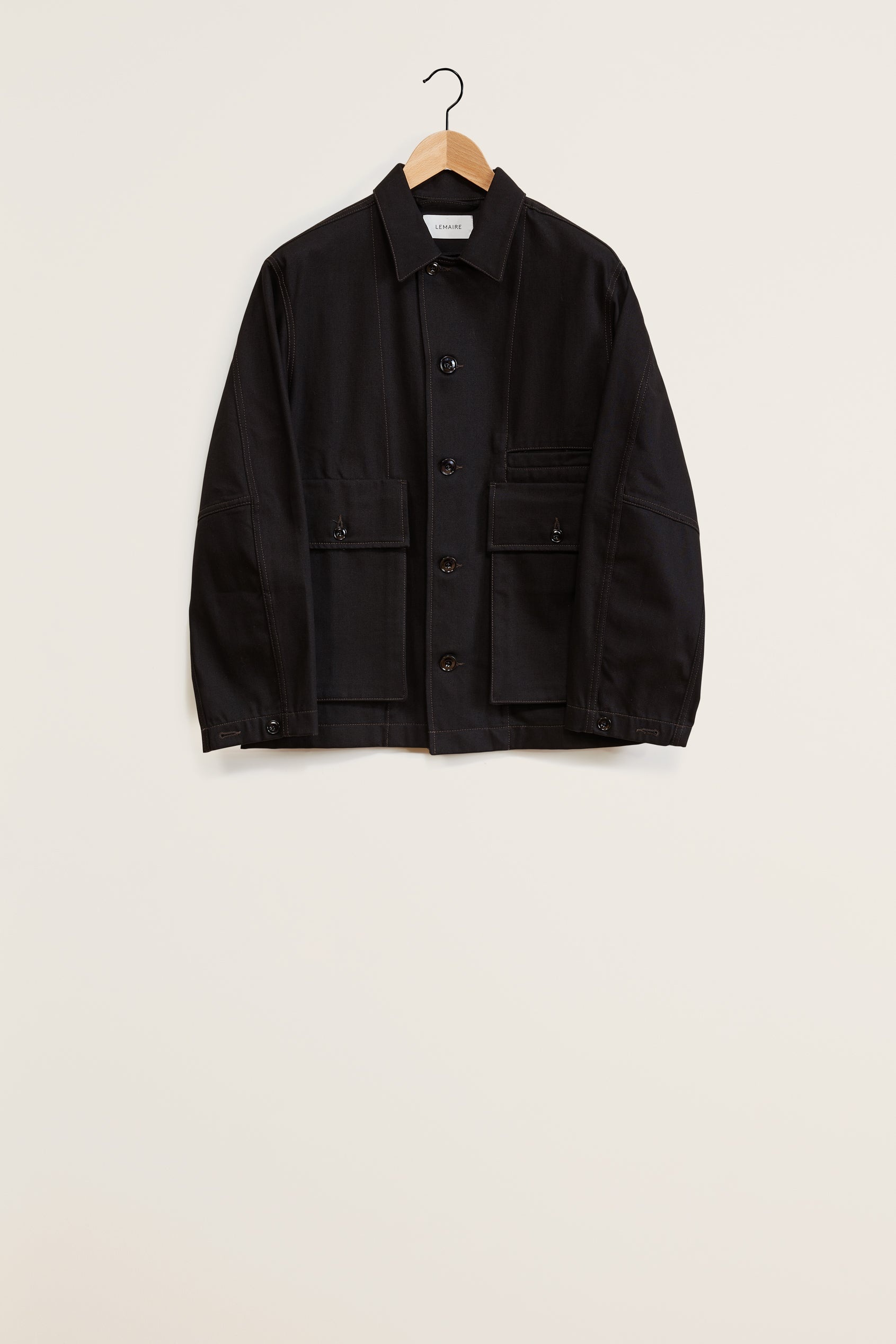 This unisex jacket is a staple of LEMAIRE’s wardrobe. It is made of a heavy denim - a classic LEMAIRE fabric - with a thick, round hand, a visible twill weave and a deep black wash. Its unlined cut is boxy and slightly cropped, with a square hem and a pleated back for ease of movement. Its workwear inspired details include layered gusseted and hand-warmer pockets, flat-fell seams and adjustable cuffs. DETAILS - Loose fit - Corozo Buttons - French placket - Welt front pocket Made in Morocco Style: OW306 LD1000 FABRICS & CARE Main Fabric: 100% Coton Soft wash 30° Do not bleach Do not tumble dry Cool ironing Soft dry clean Wash upside down