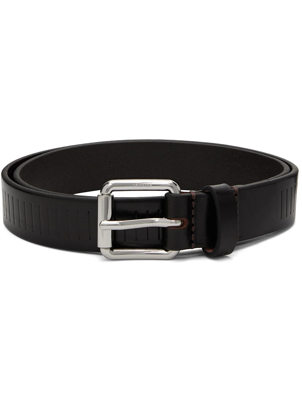 Buffed leather belt. · LWG-certified leather · Embossed stripes throughout · Keeper loop · Logo-engraved pin-buckle fastening · Silver-tone hardware · W1" Supplier color: Dark brown Leather. Made in Italy 252646F001002