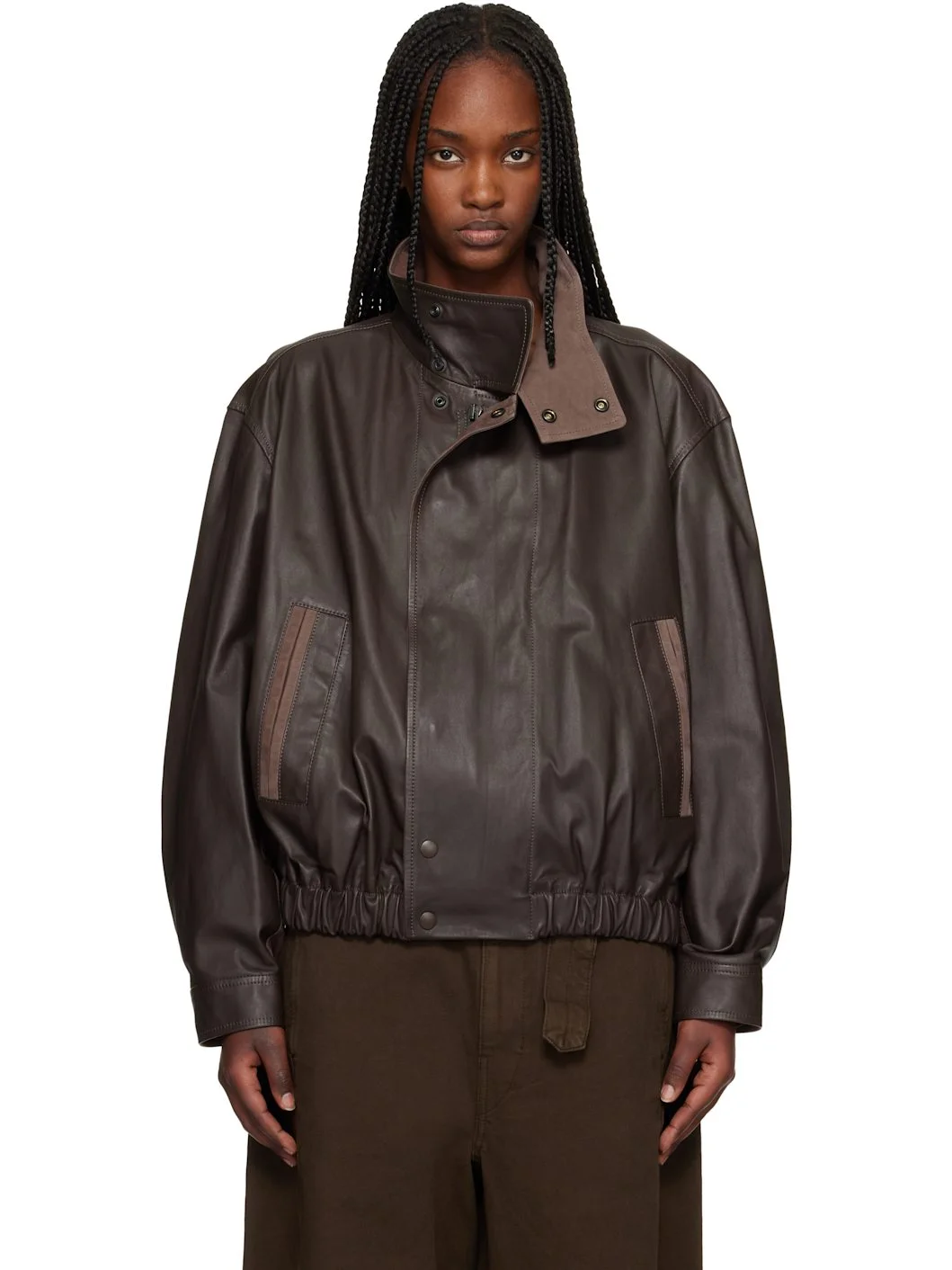 Grained leather and nubuck jacket. · Stand collar · Zip closure with press-stud placket · Welt pockets at front · Elasticized hem · Press-stud barrel cuffs · Welt pocket at interior · Full twill lining Supplier color: Chocolate Body: 100% leather. Trim: 100% cotton. Lining: 51% cotton, 49% viscose. Made in Turkey 261646F064000