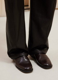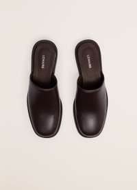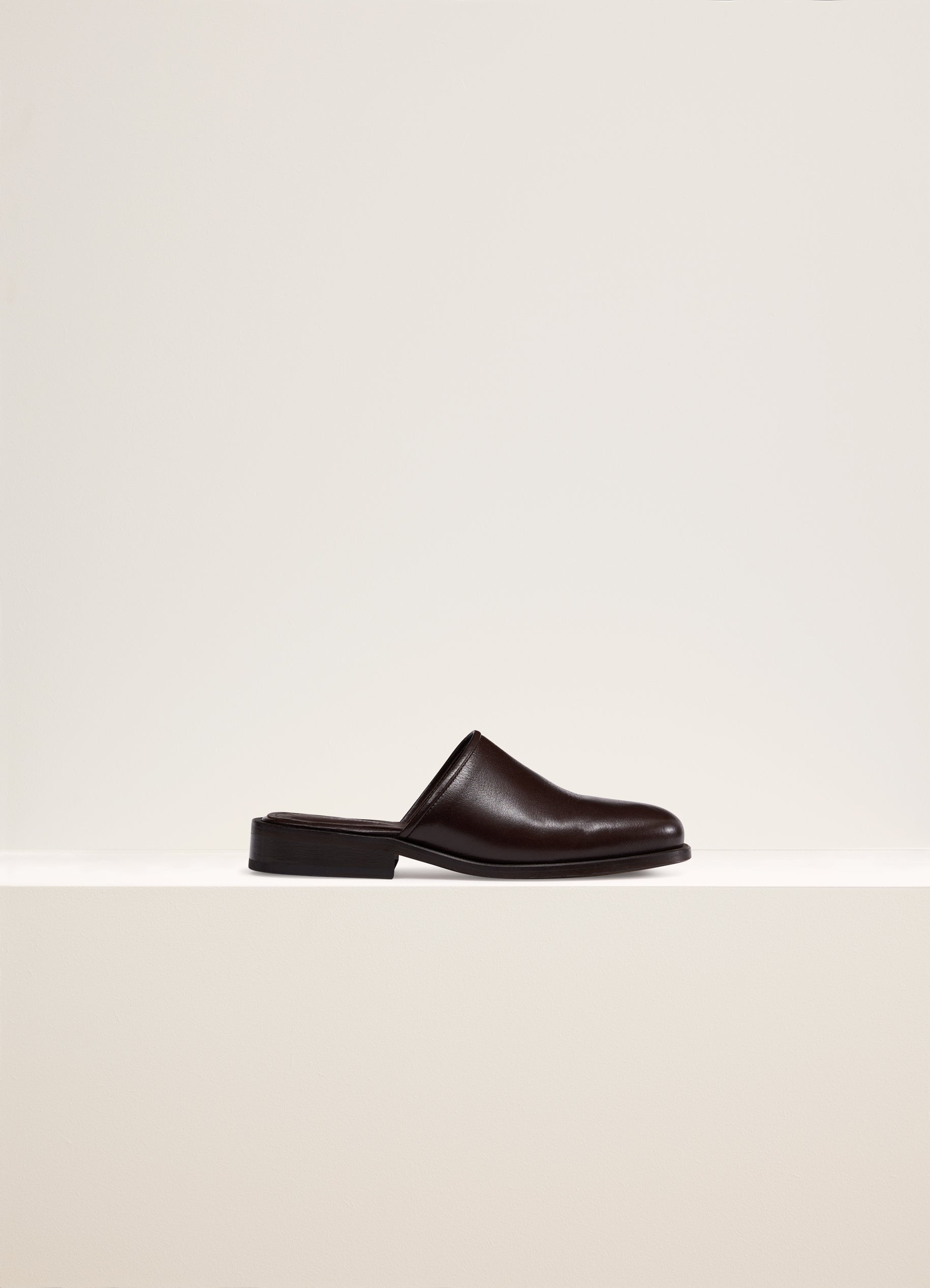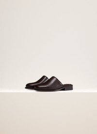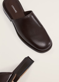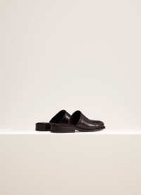 These mules are a staple of LEMAIRE’s footwear collection. They are made of vegetable-tanned buffalo leather - certified LWG Silver - with a shiny finish. Their minimal shape is built from a single piece of leather that is molded over the vamp and the square toe. A small stacked leather heel and rubber insert complete their finishings. DETAILS Leather lining - Square toe - Leather sole - Rubber insert Made in Portugal Style: FO0061 LL0042 FABRICS & CARE Main Fabric: 100% Buffalo Main Lining: 100% Veal - Calf If exposed to water or high humidity, dry your mules well with an absorbent cloth and let them air dry before storing them. You can use a soft cloth and apply a measured amount of uncolored milk or cream to give them a shine.