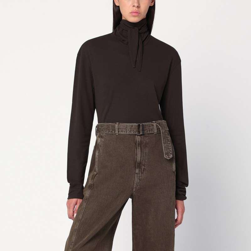 Brown espresso cotton turtleneck sweater by Lemaire, featuring an integrated scarf at the neck, long sleeves, and a straight hem.