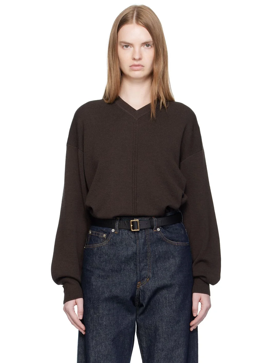 Knit wool-blend sweater. · Rib-knit V-neck, hem, and cuffs · Central purl-knit stripes at front · Dropped shoulders Supplier color: Dark cacao 50% wool, 50% acrylic. Made in Portugal 252646F100002