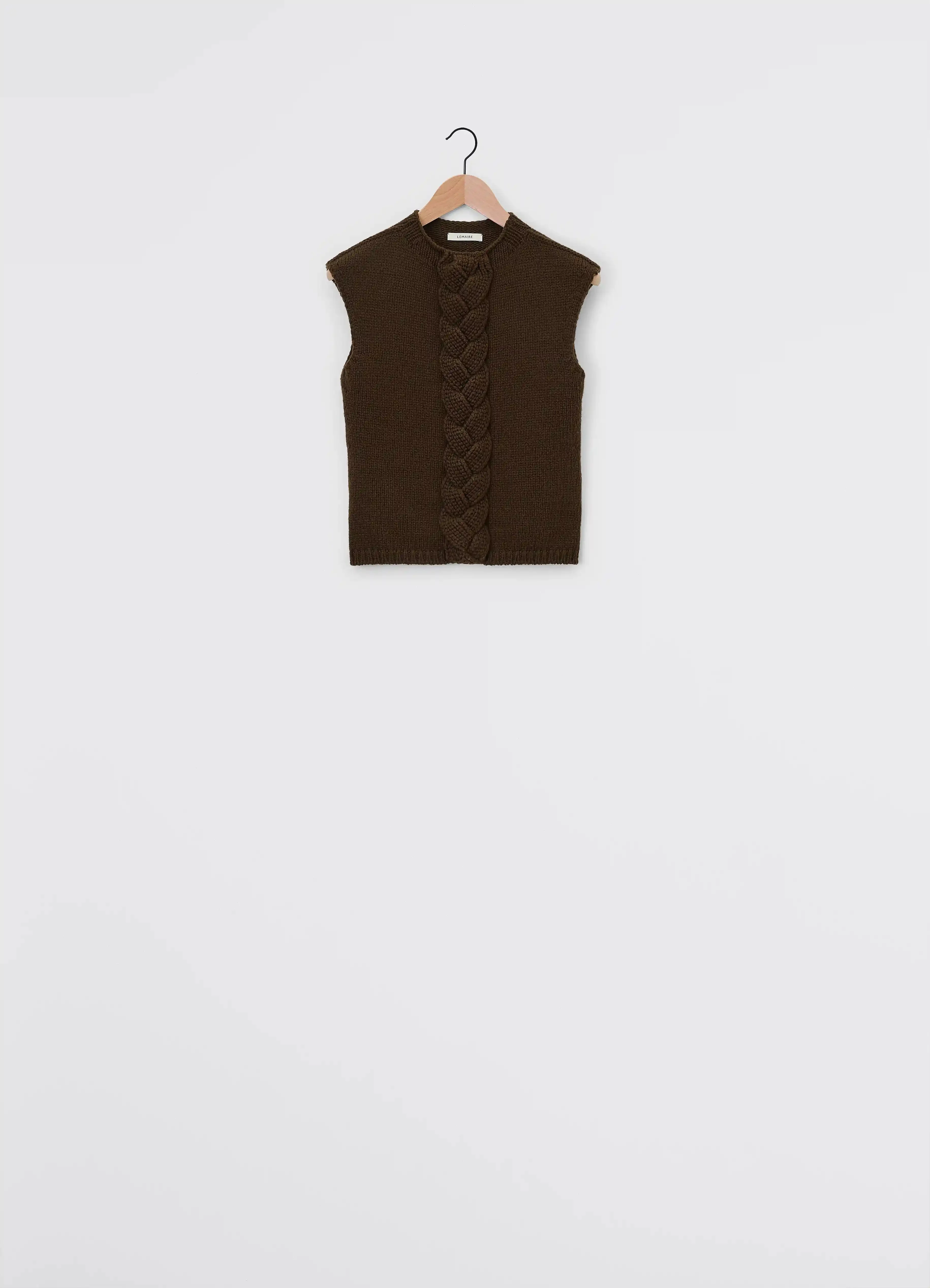 This Cable Sleeveless Jumper is crafted from a chunky blend of wool and nylon and features an oversized hand-stitched braid at the front, creating a soft, sculptural 3D texture. This warm fitted layering piece can be worn over a shirt like a vest. DETAILS - Chunky wool - Sleeveless Made in Italy Style: TO1275 LK1031 FABRICS & CARE Main Fabric: 90% Wool / 10% Polyamide/Nylon Hand wash Do not bleach Do not tumble dry Cool ironing Soft dry clean Dry flat