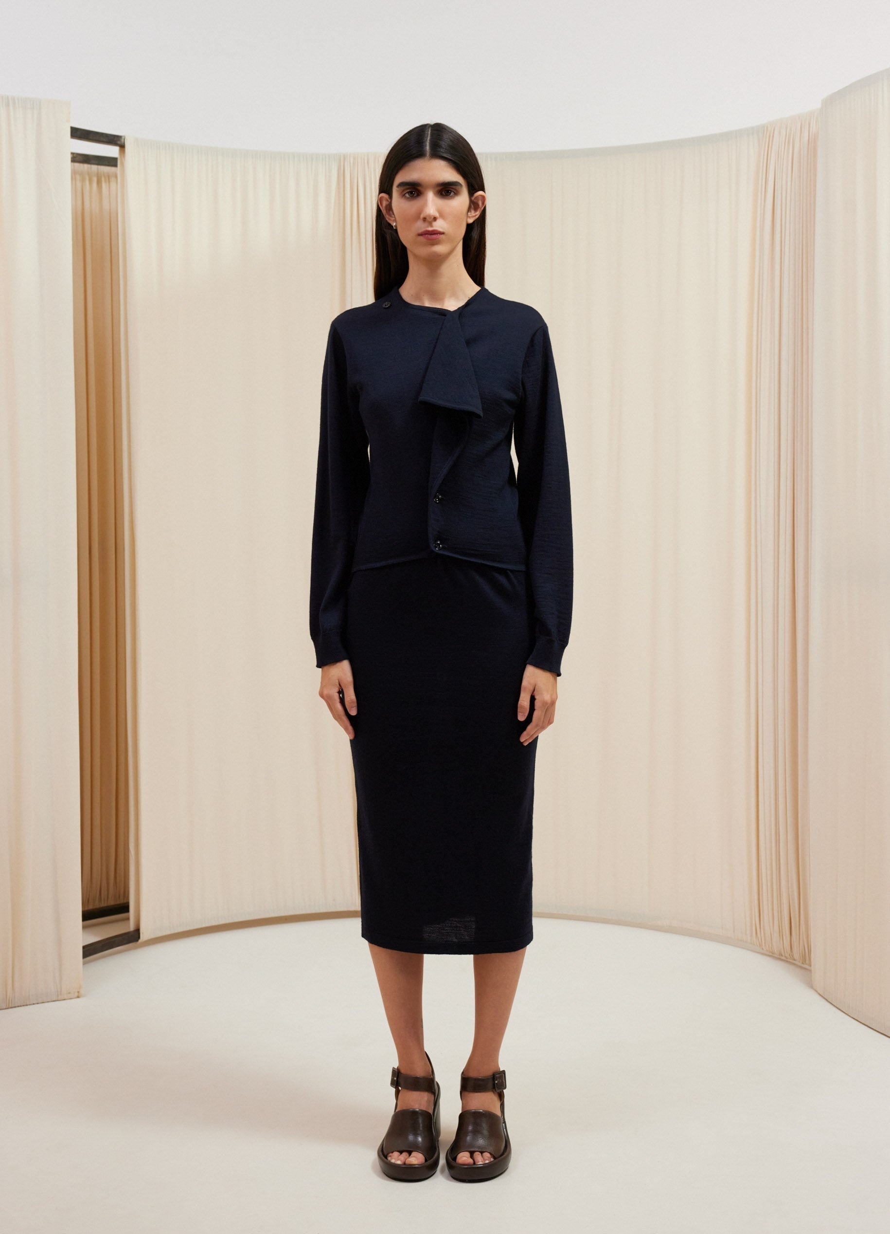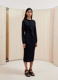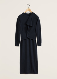 This dress is a new addition to LEMAIRE’s wardrobe, featuring a trompe l'oeil effect of superimposed fabrics. It is made from a wool-merino blend with a dry hand and a slightly mottled appearance. Inspired by a tube dress, the Cardigan Dress fits close to the body. It has classic sleeves, a crew neck and a trompe l'oeil cardigan that can be buttoned thanks to an asymmetrical placket to tighten the silhouette or let it fall on the chest like a jabot or a ruffle. These characteristics allow its wearer to play with the volume of the dress. DETAILS Fitted shape - Straight cut - Corozo buttons - Crewneck - Rib finishing at the cuffs - Below-the-knee length - Simple square hem simple Made in Portugal Style: DR1060 LK087 FABRICS & CARE Main Fabric: 50% Wool, 50% Acrylic Hand wash Do not bleach Do not tumble dry Cool ironing Soft dry clean Dry flat