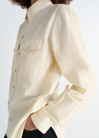 This slim-fitting western shirt features sophisticated details such as patch pockets, rivets, and metal-ringed pearlescent buttons. It is made from cotton crepe, a fabric structured with a soft hand and a slightly crinkled look. The model is 177 cm and is wearing a size 36 (S). DETAILS Fitted western shirt in cotton crepe Shirt collar Long sleeves Straight snap cuffs Front snap closure Chest patch pockets with snap flaps Inverted back pleat at the back Metal-encircled mother-of-pearl buttons Contrast topstitching Made in Tunisia Style : SH1187 LF1399 CARE Main Material: 100% Cotton Soft wash 30° Do not bleach Do not tumble dry Cool ironing Soft dry clean