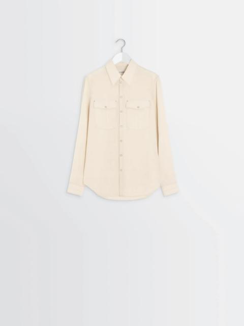 This slim-fitting western shirt features sophisticated details such as patch pockets, rivets, and metal-ringed pearlescent buttons. It is made from cotton crepe, a fabric structured with a soft hand and a slightly crinkled look. The model is 177 cm and is wearing a size 36 (S). DETAILS Fitted western shirt in cotton crepe Shirt collar Long sleeves Straight snap cuffs Front snap closure Chest patch pockets with snap flaps Inverted back pleat at the back Metal-encircled mother-of-pearl buttons Contrast topstitching Made in Tunisia Style : SH1187 LF1399 CARE Main Material: 100% Cotton Soft wash 30° Do not bleach Do not tumble dry Cool ironing Soft dry clean