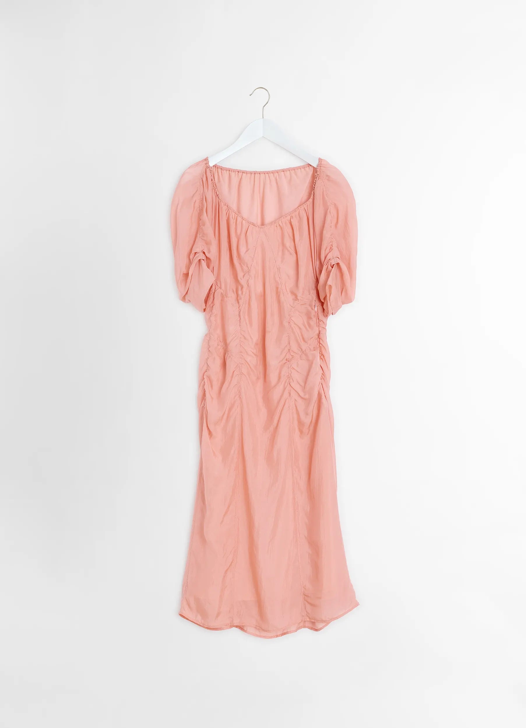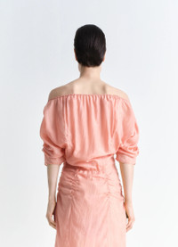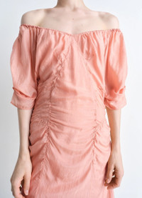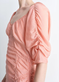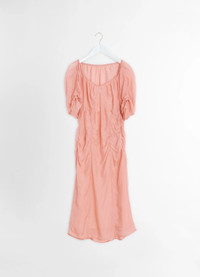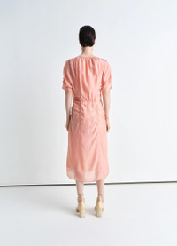 This Midi Dress reflects the dance-inspired theme dear to LEMAIRE this season. Drawing inspiration from the dresses worn by Pina Bausch, it is crafted from airy and light silk chiffon, with a soft touch, a subtle sheen and a slightly crinkled texture. A light cotton voile lining is attached at the neckline, making this piece incredibly comfortable to wear. Its design is detailed with tonal stitching and gathers that gently ruche the seams. The slightly plunging, elasticated neckline allows for an off-the-shoulder look if desired. The unlined elbow-length sleeves feature gathers, adding volume and movement to the silhouette. An invisible zipper ensures easy wear. DETAILS - Fitted cut - Midi length - U-shaped neck - Elasticated collar and shoulders - Gathers and stitching details - Invisible side zip - Cotton lining Made in Portugal Style: DR1098 LF1373 The Model is 180cm / 5' 11" ft and is wearing a size 36 (S). FABRICS & CARE Main Fabric : 100% Silk Main Lining : 100% Cotton Do not wash Do not bleach Do not tumble dry Cool ironing Soft dry clean Discover the traceability