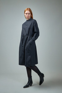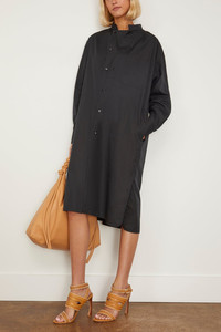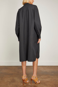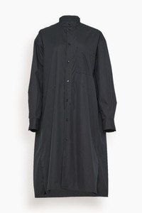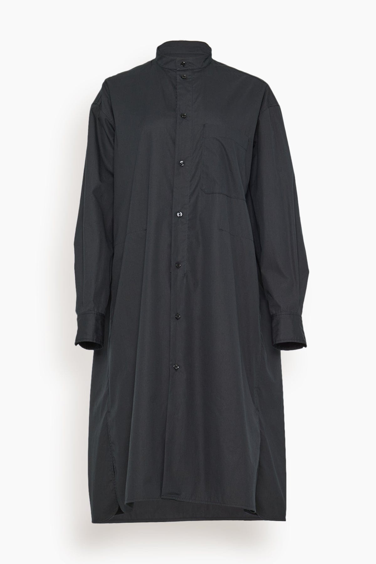 The Lemaire Officer Collar Shirt Dress in Caviar is made of heavy poplin woven from organic cotton yarn, with a smooth surface and a compact feel. Inspired by mens shirting, it fits like an oversized shirt dress featuring a triangular panel below the stand collar that can be draped across the chest when unbuttoned. We love it worn with tall boots and a tote. - Loose fit - Stand collar - Corozo buttons - Below-the-knee length - Adjustable buttoned cuffs - Side vents - Back yoke - Main Fabric : 100% Cotton - Made in Romania