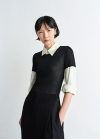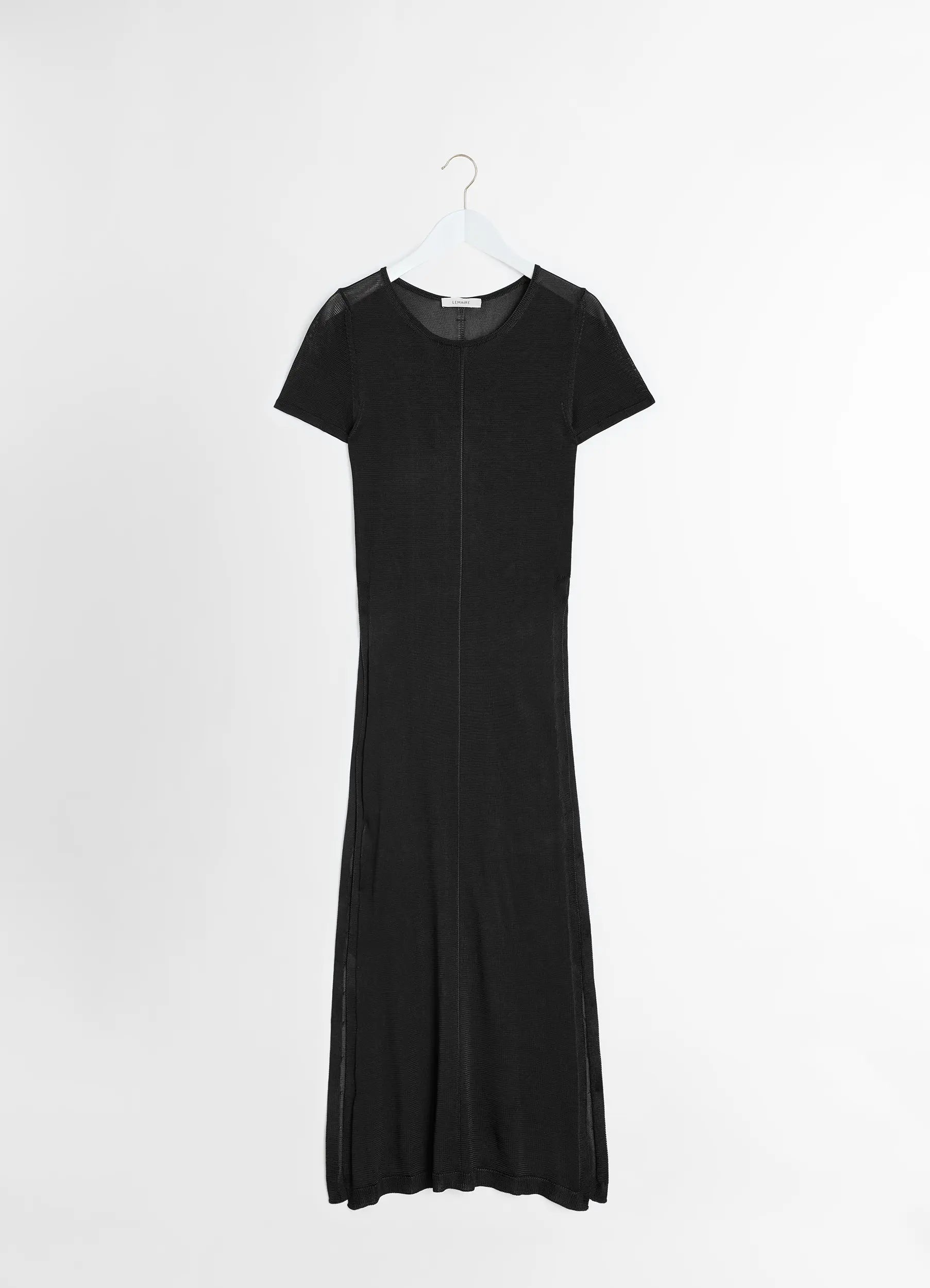 The new short sleeved dress debuts this season in the LEMAIRE vestiaire. It is crafted in shiny viscose, a new fluid material at LEMAIRE with a soft hand and a luminous finish, which reflect the light and adds radiance to the silhouette. It boasts slits on both legs running all the way to the waist, adding movement to the walk. This playful and slightly see-through number can be worn on its own or over a pair of trousers or shorts. DETAILS - Fitted shape - Long slits - Short sleeves - Slightly transparent - This dress can be worn as a second layer Made in Italy Style: DR1104 LK1037 FABRICS & CARE Main Fabric: 100% Viscose Hand wash Do not bleach Do not tumble dry Cool ironing Soft dry clean Dry flat
