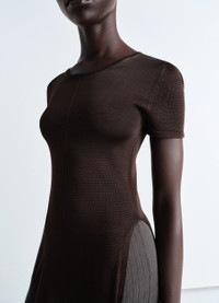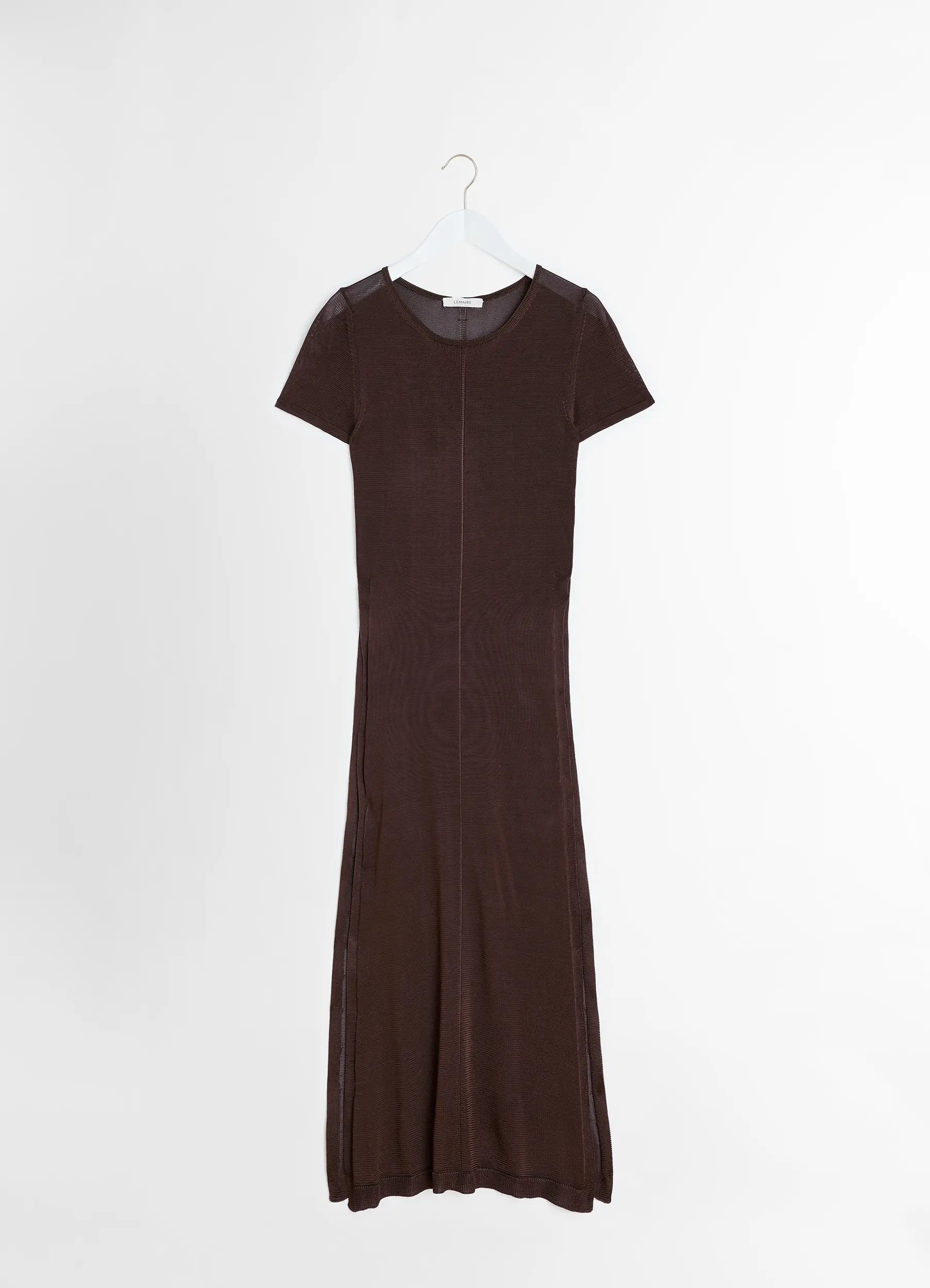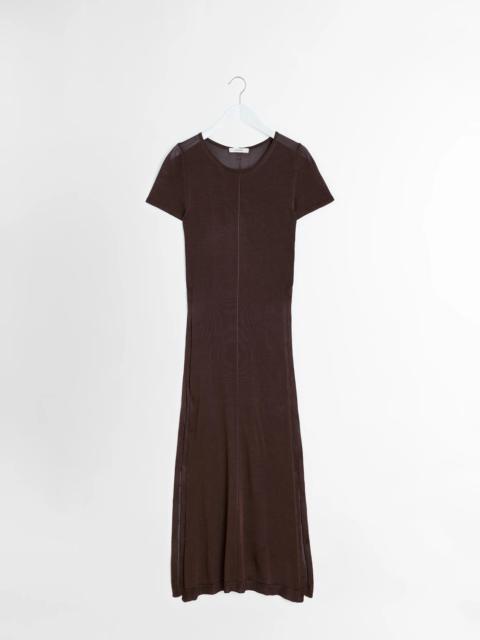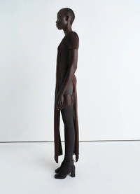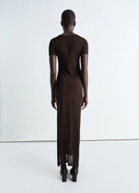 The new short sleeved dress debuts this season in the LEMAIRE vestiaire. It is crafted in shiny viscose, a new fluid material at LEMAIRE with a soft hand and a luminous finish, which reflect the light and adds radiance to the silhouette. It boasts slits on both legs running all the way to the waist, adding movement to the walk. This playful and slightly see-through number can be worn on its own or over a pair of trousers or shorts. DETAILS - Fitted shape - Long slits - Short sleeves - Slightly transparent - This dress can be worn as a second layer Made in Italy Style: DR1104 LK1037 FABRICS & CARE Main Fabric: 100% Viscose Hand wash Do not bleach Do not tumble dry Cool ironing Soft dry clean Dry flat