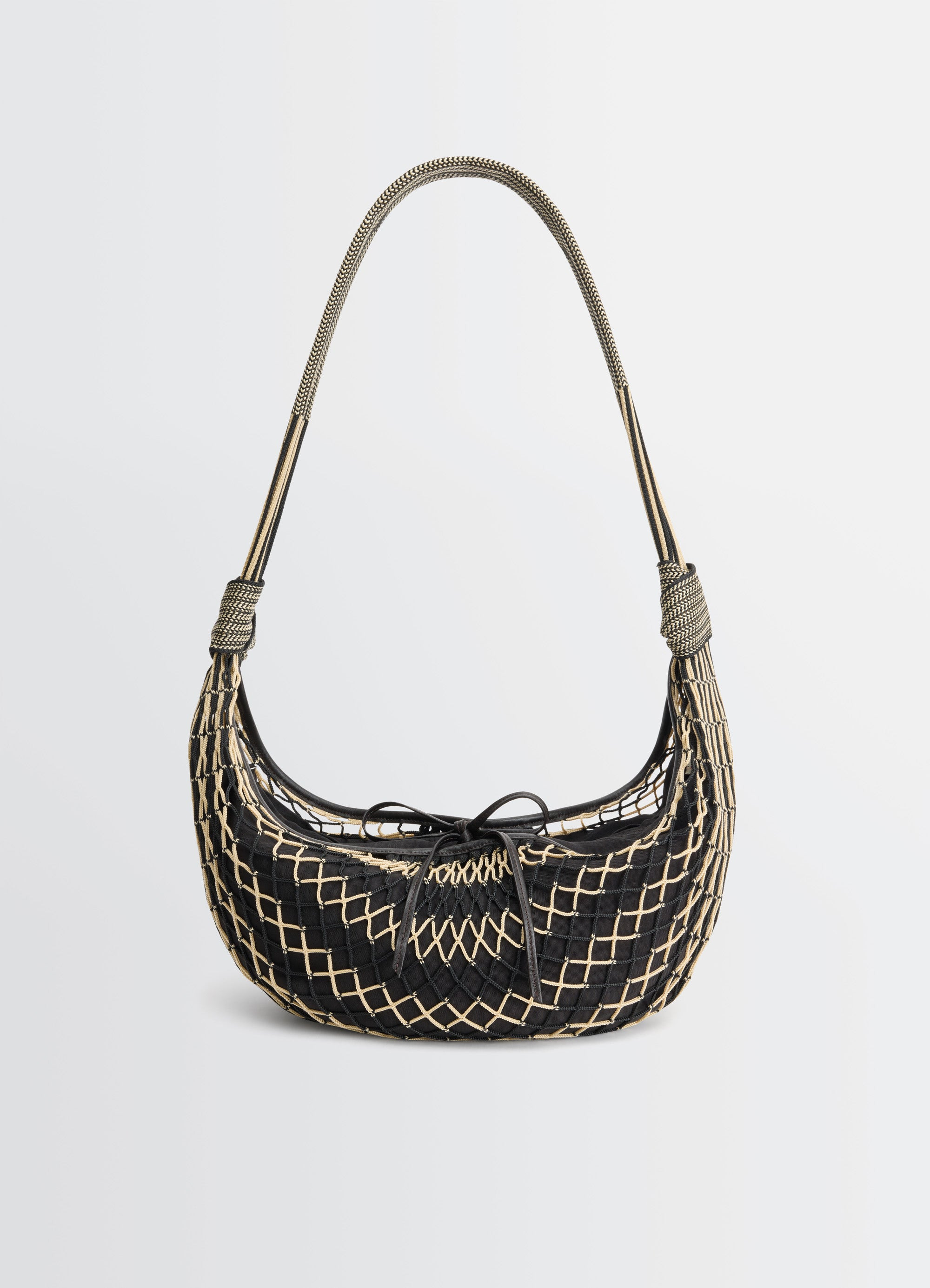 The result of a collaboration between Lemaire and Filt, the oldest French manufacturer of net shopping bags (established 1860), this bag is inspired by the iconic Croissant line and an everyday object. This piece is a 2-in-1 interpretation, achieved by combining a nylon net with a removable inner bag. DETAILS Filt Fortune Croissant bag in nylon net soft 2-in-1 design Hand or shoulder carry Woven strap with knot-style accents Outside bag in openwork nylon net Leather-tie closure Labels including a Lemaire-embossed leather and a woven Filt logo Removable nylon interior bag with snap fasteners Zipper closure with extended pull tab Nylon lining Zipped interior pocket with leather Lemaire-embossed label Dimensions: Length: 53 cm Height: 21 cm Depth: 16 cm Arrow height: 40 cm Made in France Style : BG0128 TP0006 FABRICS & CARE Main Fabric: 100% Polyester Second Fabric: 100% Lamb Main lining: 100% Polyamide/Nylon Do not wash Do not bleach Do not tumble dry Do not iron Professional leather clean only