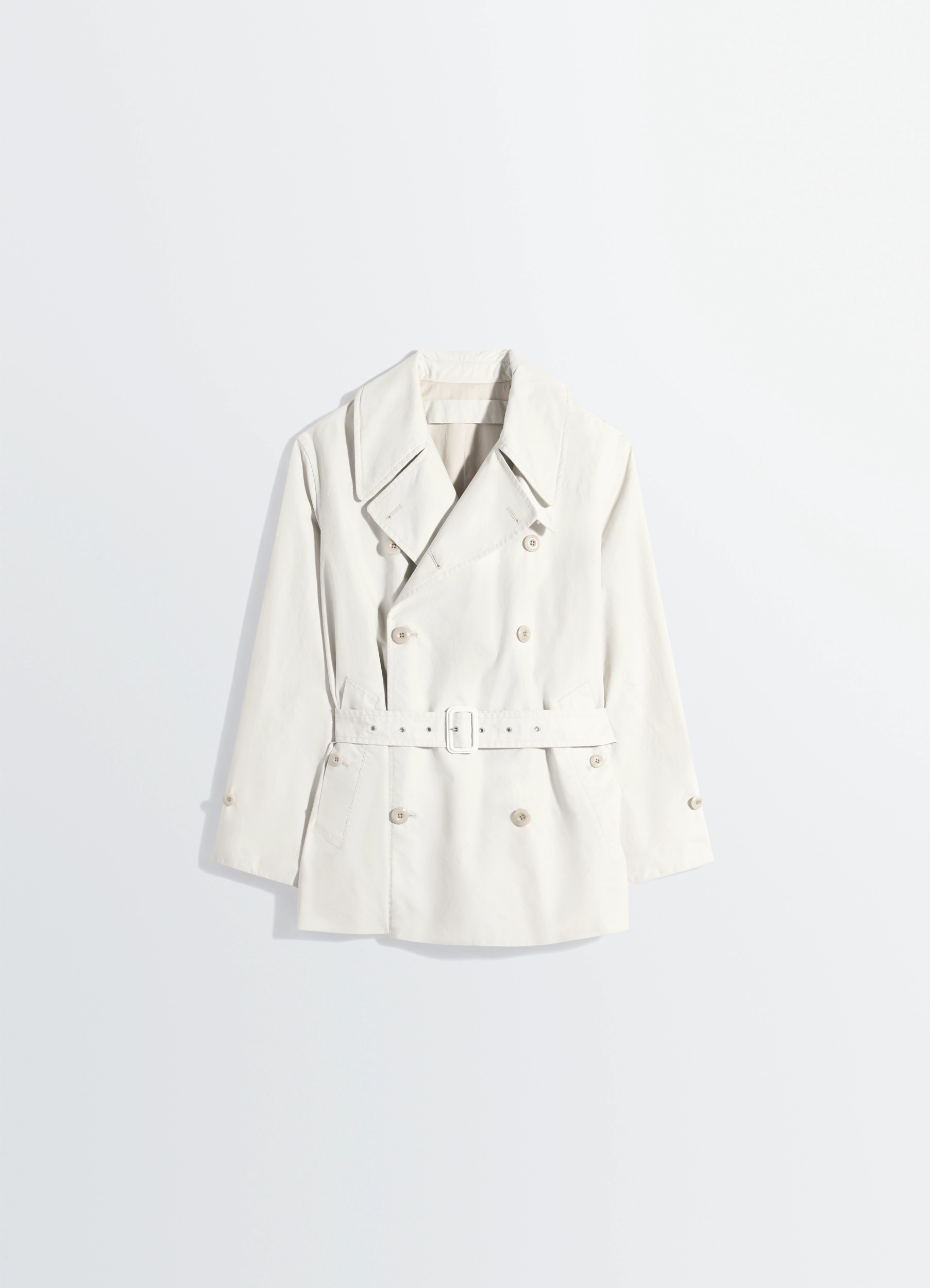 This short trench coat in water-repellent VENTILE® cotton is fully lined. The tightly woven fabric is breathable and protective, with a soft, subtly glossy water-repellent finish. The model is 177 cm tall and wears a size 36 (S). This short trench coat in water-repellent VENTILE® cotton is fully lined. The tightly woven fabric is breathable and protective, with a soft, subtly glossy water-repellent finish. The model is 177 cm tall and wears a size 36 (S). DETAILS Short trench coat in water-repellent VENTILE® cotton Oversized fit Short lined model Trench collar with chin strap Long sleeves with adjustable buttoned tabs Double-breasted closure Buttoned side pockets Removable adjustable belt VENTILE® collaboration label inside Made in Romania Style: OW1203 LF1570 Short trench coat in water-repellent VENTILE® cotton Oversized fit Short lined model Trench collar with chin strap Long sleeves with adjustable buttoned tabs Double-breasted closure Buttoned side pockets Removable adjustable belt VENTILE® collaboration label inside Made in Romania Style: OW1203 LF1570 CARE Main fabric: 100% cotton Do not wash Do not bleach Do not tumble dry Cool ironing Soft dry clean Main fabric: 100% cotton Do not wash Do not bleach Do not tumble dry Cool ironing Soft dry clean