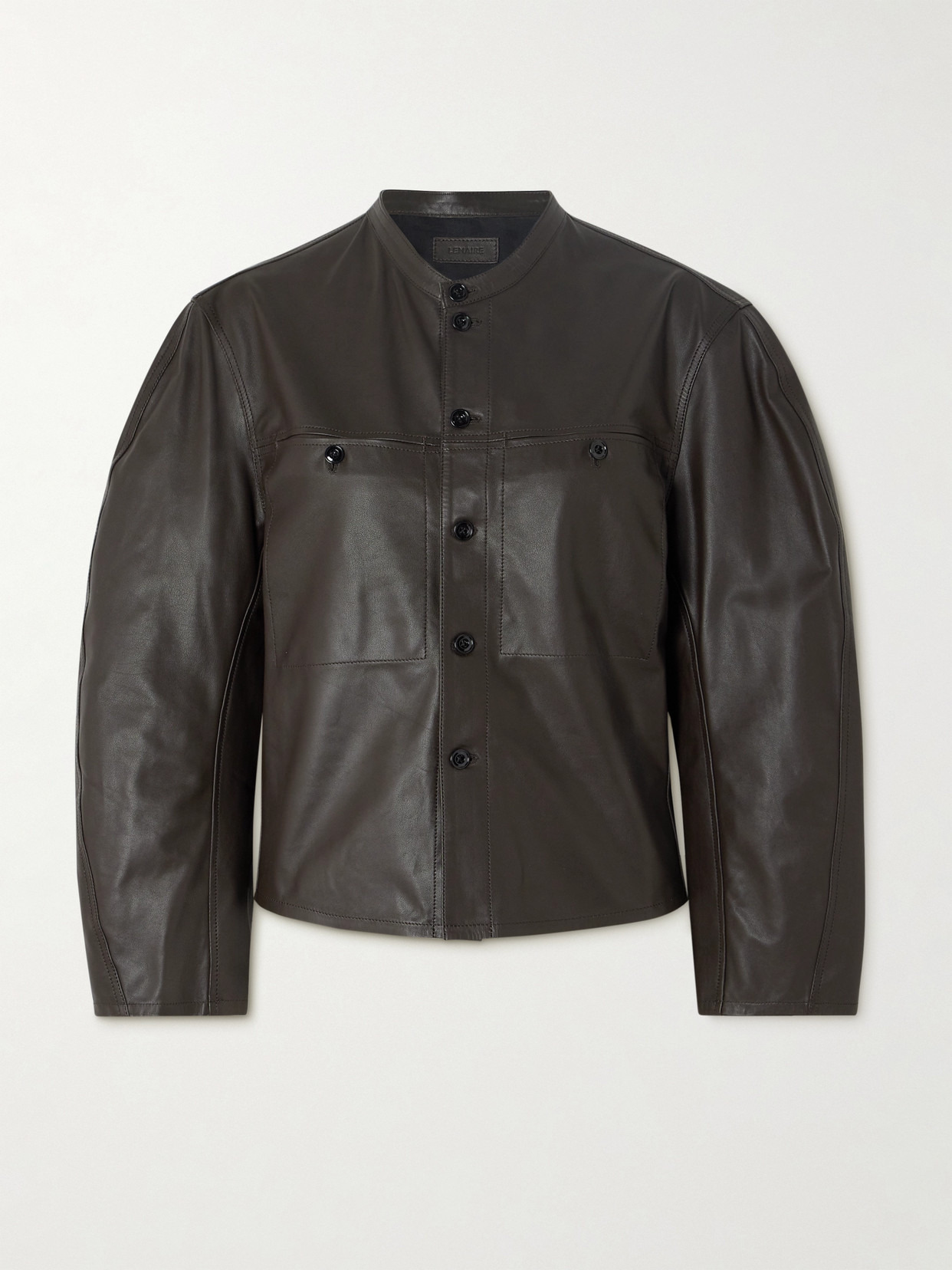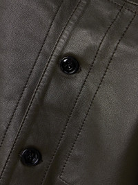 This jacket is a new addition to LEMAIRE’s family of leather ready-to-wear. It is made of soft nappa cow leather – a classic LEMAIRE fabric – with a smooth, supple hand as well as a shiny finish. This Jacket features slightly twisted side-seams, giving the arm a curved shape as a nod to the Twisted Belted Pants. a stand-up collar and two slot chest pockets enhancing its fitted shape. The Curved Sleeve Jacket in leather is shorter than its denim counterpart. DETAILS Fitted shape - Stand-up collar - Curved sleeves with twisted seams - A placket with Corozo buttons - Two chest slot pockets Made in Turkey Style: JA1045 LL0068 FABRICS & CARE Main Material: 100% Cow Leather Main Lining: 51% Cotton / 49% Viscose Secondary Lining: 100% Cotton Do not wash Do not bleach Do not tumble dry Do not iron Professional leather clean only