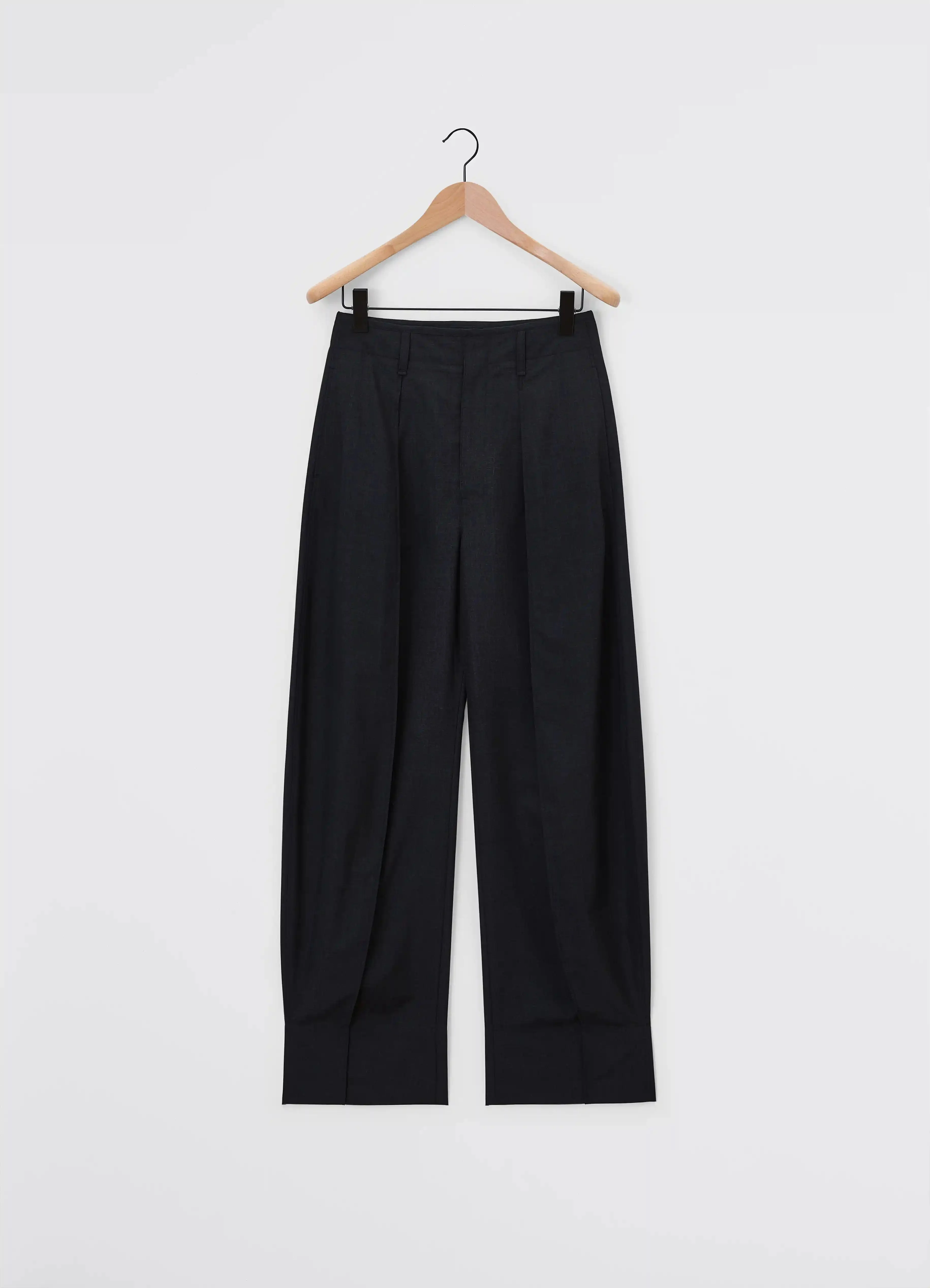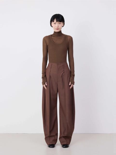 These pants are a new addition to the feminine LEMAIRE wardrobe. The Curved Volume Tailored Pants are made from poly-wool woven into a melange twill, with a dense yet supple hand for fluid tailoring. The balloon-like silhouette of the oversized leg is created by a pleat and a seam running down the tapered hem to maintain both volume and structure. There are belt loops at the waist, as well as seam pockets at the hip. These trousers fasten with a classic zip fly and waistband button. DETAILS - Relaxed fit - Curved leg - Front pleat - Front seam - Seam pockets - Wide cuffs Made in Romania Style: PA1118 LF414 FABRICS & CARE Main Fabric: 55% Polyester / 45% Wool Main Lining: 100% Cotton Do not wash Do not bleach Do not tumble dry Cool ironing Soft dry clean
