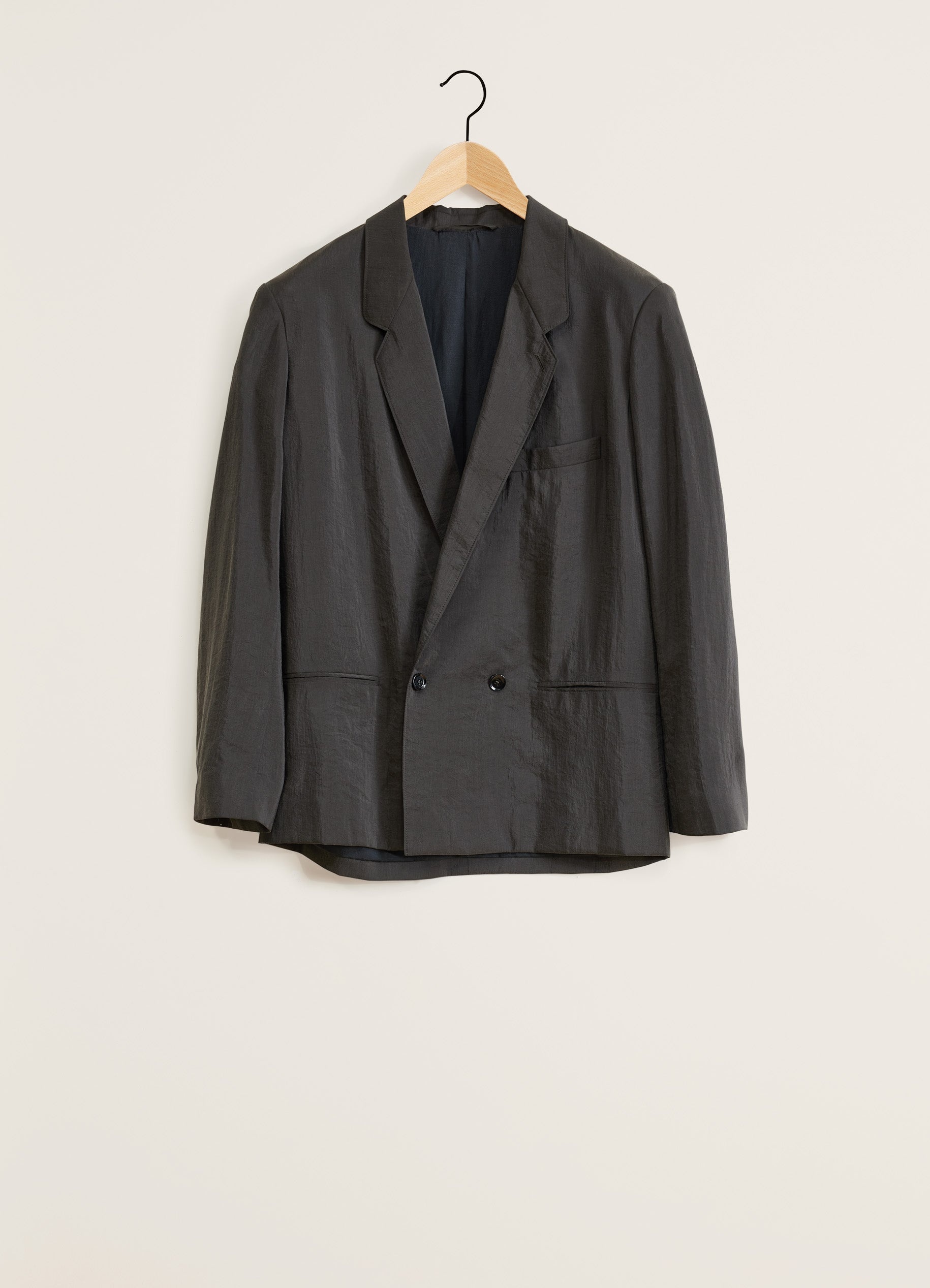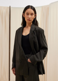 This jacket is a staple of LEMAIRE’s wardrobe. It is made of dry silk, a classic LEMAIRE fabric with a soft hand and tonic texture. Its relaxed and deconstructed fit allow the jacket to be worn loose. It features a two buttons double-breasted closure that can also be fastened on its interior using a buttoned strap, a convertible lapel and three patch pockets on the front. DETAILS - Loose fit - Fully lined - Corozo buttons - Convertible lapel - Two interior pockets Made in Slovakia Style: JA1034 LF208 FABRICS & CARE Main Fabric: 76% Silk / 24% Polyamide/Nylon Main Lining: 51% Cotton / 49% Viscose Do not wash Do not bleach Do not tumble dry Cool ironing Soft dry clean