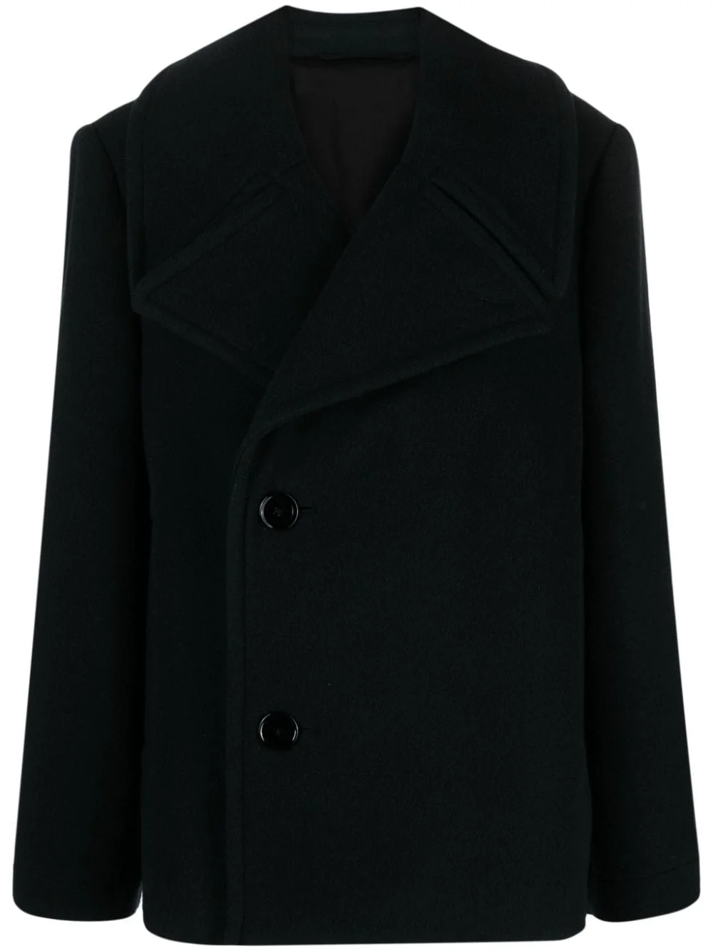 double-breasted wool coat Parisian brand LEMAIRE demonstrates its preference for high-quality materials and classic silhouettes with this short green coat. It is crafted from a cotton and wool blend in a timeless double-breasted design. Highlights - Dark green - Cotton-wool blend - Wide notch lapels - Double-breasted button fastening - Two side inset pockets - Long sleeves - Straight hem Imported Composition Lining: Cotton 100%, Viscose 100% Outer: Wool 100% SIZE & FIT Model measurements Height 5 ft 10 in(1.77 m) Bust/Chest 32.28 in(82 cm) Hips 35.03 in(89 cm) Waist 25.19 in(64 cm) FittingInformation Designed to be unstructured, offering a loose fit throughout Made from a midweight non-stretch fabric This piece fits true to size – take your usual size Washing instructions Dry Clean Only
