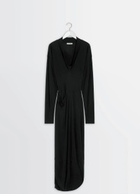 Inspired by Lemaire's taste for the link between comfort and elegance, this V-neck dress in viscose crepe jersey features draped elements, completing the house's feminine wardrobe. The model is 177 cm tall and is wearing a size 36 (S). DETAILS V-neck dress in viscose crepe jersey Fitted cut Midi-length Draped V-neck panel Long sleeves Drape-style waist panel with pocket Made in Portugal Style : DR1127 LJ1040 CARE Main Material: 100% Viscose Do not wash Do not bleach Do not tumble dry Cool ironing Soft dry clean Dry flat