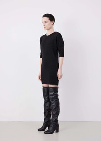 This new dress complements LEMAIRE's feminine vestiaire. It is crafted in a blend of recycled acrylic fibers and RWS-certified wool for a warm, soft hand. It is ribbed at the cuff and features detachable half-sleeves which tie to the inside of the upper arm via a single corozo button. The fit is elongated and can be worn as a short dress or layered over trousers or a skirt, for example. DETAILS - Elongated fit - Detachable sleeves - Round collar - Ribbed cuffs Made in Italy Style: DR1088 LK1028 FABRICS & CARE Main Fabric: 45% Acrylique, 40% Alpaga, 15% Wool
