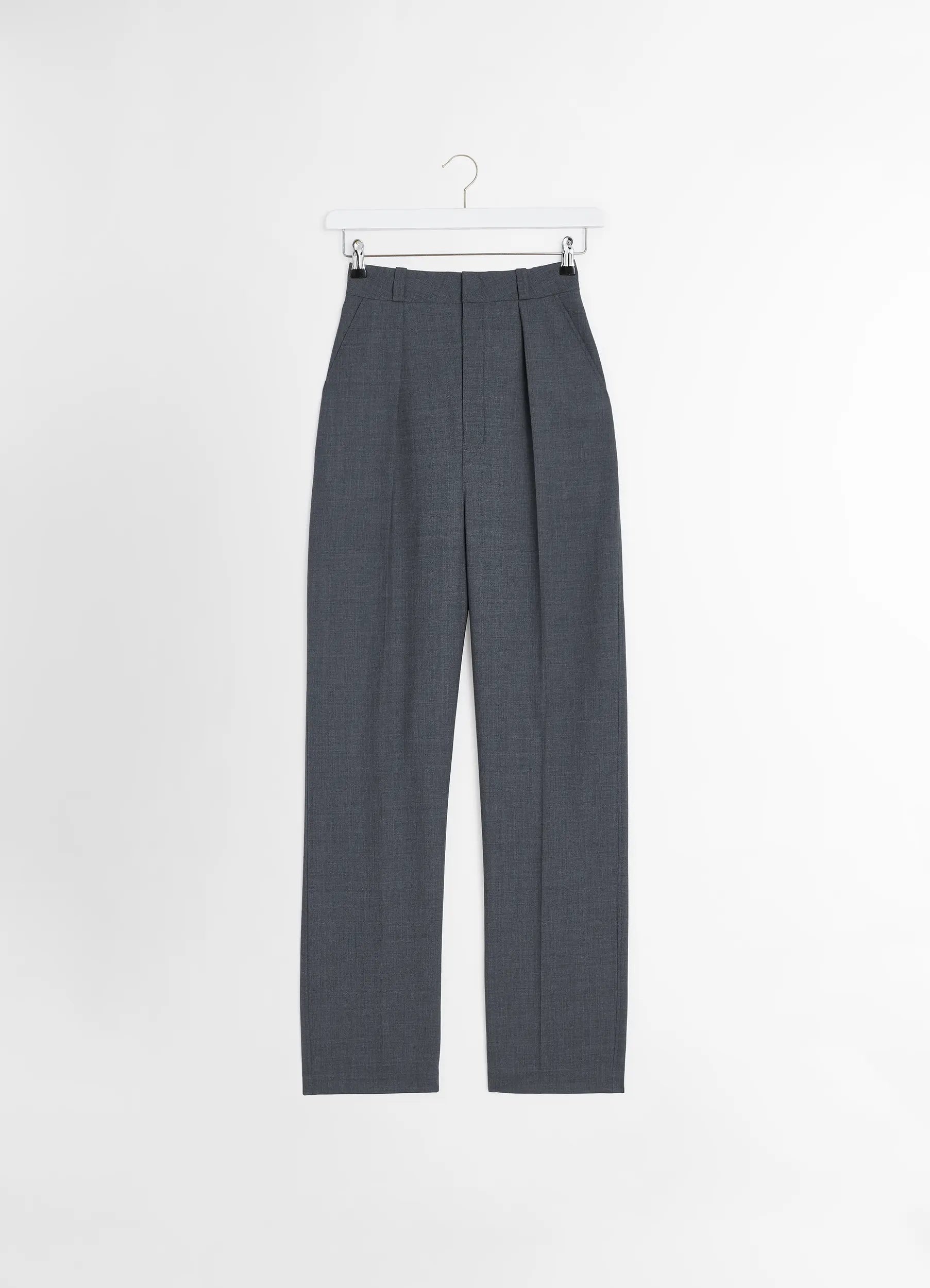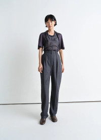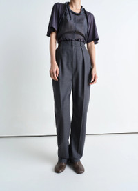 These Dropped Crotch Soft Pants are crafted from light tropical wool, woven into a melange twill, a dense yet supple material enabling fluid tailoring with a soft feel. The slightly tapered leg enhances the silhouette, while classic tailoring details include diagonal seam pockets and belt loops. There are two diagonal side seam pockets as well as two welt pockets at the back. This style also features a zip fly, a closing hook and a tailored waistband, a reference to the classic menswear design codes dear to LEMAIRE. DETAILS Straight fit Pleats on the leg Low crotch Welt side pockets Welt back pockets Zip fly and hook Made in Romania Style : PA1183 LF1386 The Model is 176cm / 5' 9½'' ft and is wearing a size 36 (S). FABRICS & CARE Main Fabric: 100% Wool Main Lining: 100% Cotton Do not wash Do not bleach Do not tumble dry Cool ironing Soft dry clean
