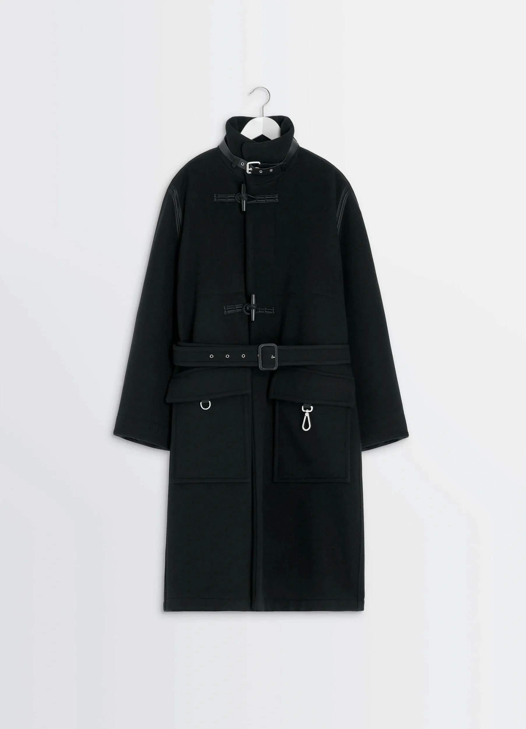 This duffle coat is an archetypal piece reinterpreted by Lemaire with shiny piping and utilitarian metallic details. Crafted in double-faced wool, it offers a soft, warm wear. This piece is an ideal combination of sophistication and functionality. The model is 177 cm tall and is wearing a size 36 (S). This duffle coat is an archetypal piece reinterpreted by Lemaire with shiny piping and utilitarian metallic details. Crafted in double-faced wool, it offers a soft, warm wear. This piece is an ideal combination of sophistication and functionality. The model is 177 cm tall and is wearing a size 36 (S). DETAILS Double-faced wool duffle coat Oversized cut Semi-lined model Stand-up collar with snap closure, belt loops, and metal-buckle belt Long sleeves finished off with snaps Closure with snaps and satin frog fasteners Belt loops and removable belt with leather-wrapped buckle and metal ring at the back Patch pockets with flaps, ring, and carabiner clasp in front Satin piping on armholes and sleeves Inside patch pockets Made in Lithuania Style : CO1112 LF1116 Double-faced wool duffle coat Oversized cut Semi-lined model Stand-up collar with snap closure, belt loops, and metal-buckle belt Long sleeves finished off with snaps Closure with snaps and satin frog fasteners Belt loops and removable belt with leather-wrapped buckle and metal ring at the back Patch pockets with flaps, ring, and carabiner clasp in front Satin piping on armholes and sleeves Inside patch pockets Made in Lithuania Style : CO1112 LF1116 CARE Main Material: 100% Wool Main Lining: 100% Viscose Second Lining: 56% Cotton 44% Viscose Third Lining: 100% Cotton Technichal materials 2: 100% Cow Leather Technichal materials: 100% Veal Leather Main Material: 100% Wool Main Lining: 100% Viscose Second Lining: 56% Cotton 44% Viscose Third Lining: 100% Cotton Technichal materials 2: 100% Cow Leather Technichal materials: 100% Veal Leather