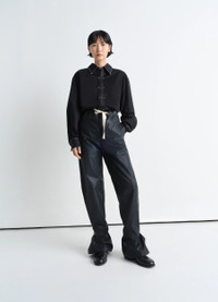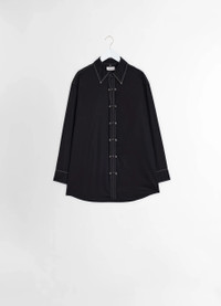 This unisex shirt is crafted from light cotton satin, offering a soft touch and fluid texture with a subtle sheen. Contrast stitching details run along the button placket, around the cuffs, along the collar, and form a pointed pattern on the back. The snap buttons are made of silver metal and black mother-of-pearl. The central buttons, as well as the collar's tips and the back yoke, all boast metal rivets adorned with silver rings that catch the light like pierced pieces of jewellery DETAILS - Relaxed fit - Pointed collar and yoke - Silver rivet and rings details - Metal and black mother-of-pearl buttons - Contrast stitching Made in Portugal Style: SH1147 LF1207 The Model is 188cm / 6'2'' ft and is wearing a size 48 (M). FABRICS & CARE Main Fabric: 100% Cotton Trims: 100% Metal Do not wash Do not bleach Do not tumble dry Cool ironing Soft dry clean Discover the traceability