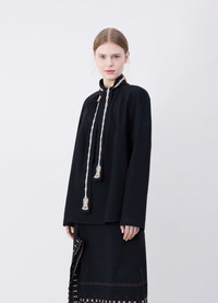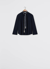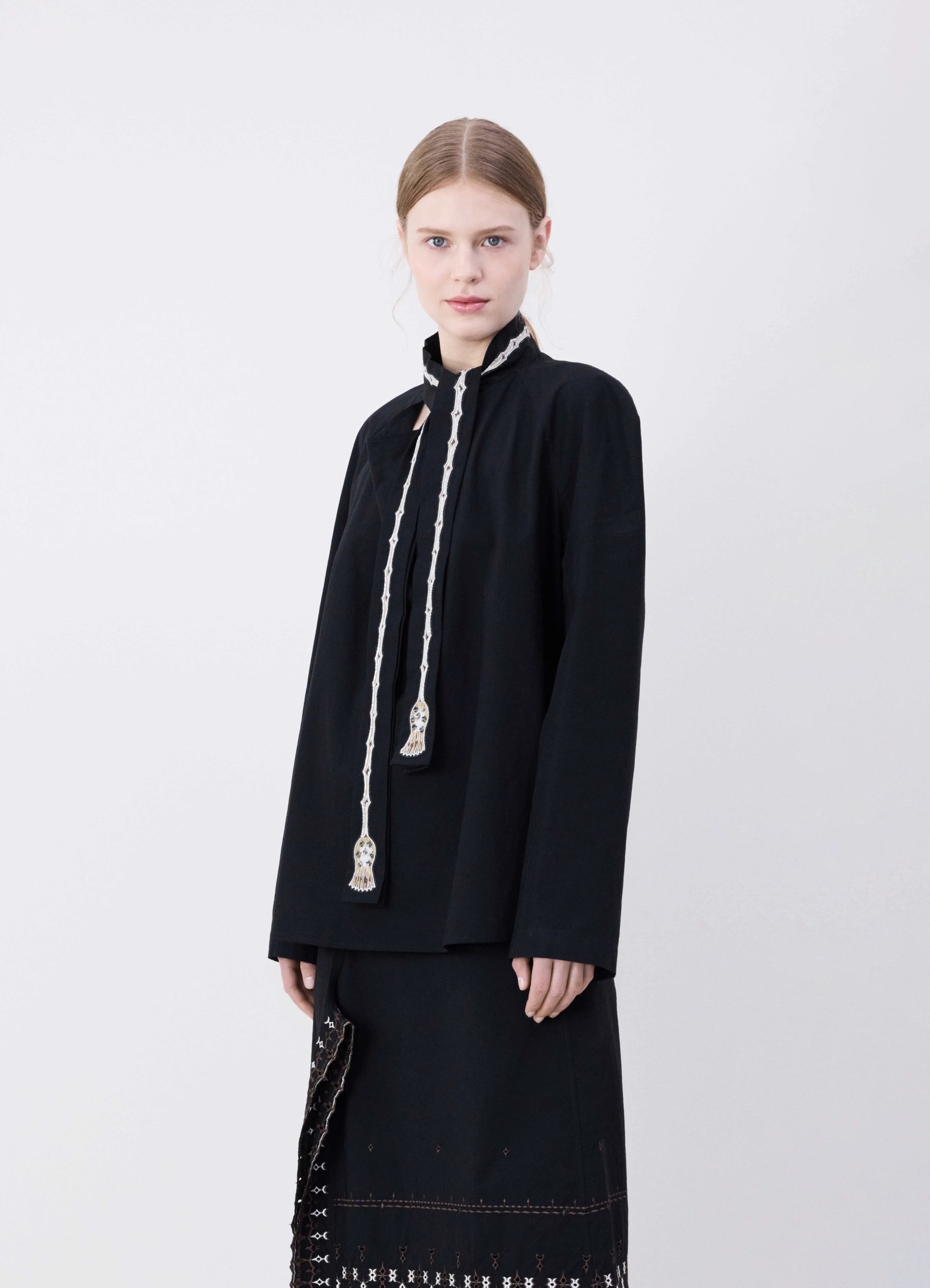 This new blouse is part of a collaboration between LEMAIRE and artistic duo FreelingWaters. The Embroidered Ascot blouse is crafted in yarn-dyed cotton crepe with a washed effect and a light, fluid hand. Its lavalliere collar is printed with a shard motif embroidered with small white pearls. It can be tied in various ways, sitting atop round raglan sleeves and loose, slightly flared silhouette. DETAILS - Loose fit - Lavalliere collar - Pearl embroideries - Raglan sleeves Made in Tunisia Style: TO1307 LF1067 FABRICS & CARE Main Fabric: 100% Cotton Hand wash Do not bleach Do not tumble dry Cool ironing Soft dry clean