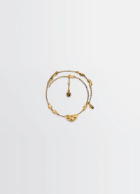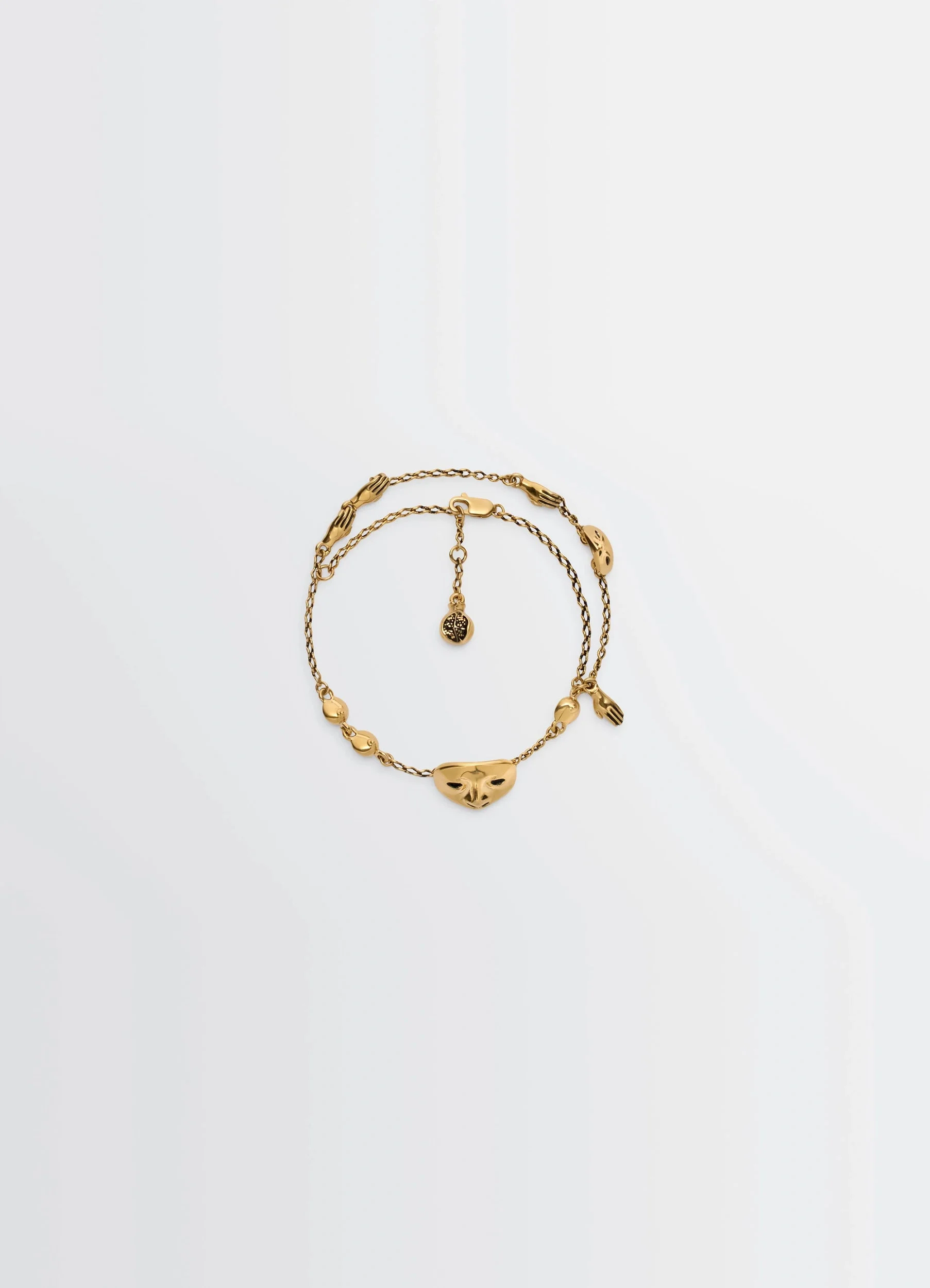 The Estampe bracelet is made of brass with an old gold finish. Delicate figurative charms representing a mask, hands, a grenada and a heart are articulated on fine, openplated chains. DETAILS Spring ring clasp Width 17,5 cm First hole 21 cm Second hole 22 cm Made in France Style : JW0017 LO036 FABRICS & CARE Main Material: 100% Brass Be careful not to expose your jewellery to perfumes, detergents, and remove it when exposed to water. To clean and shine them, you can use a soft cloth.