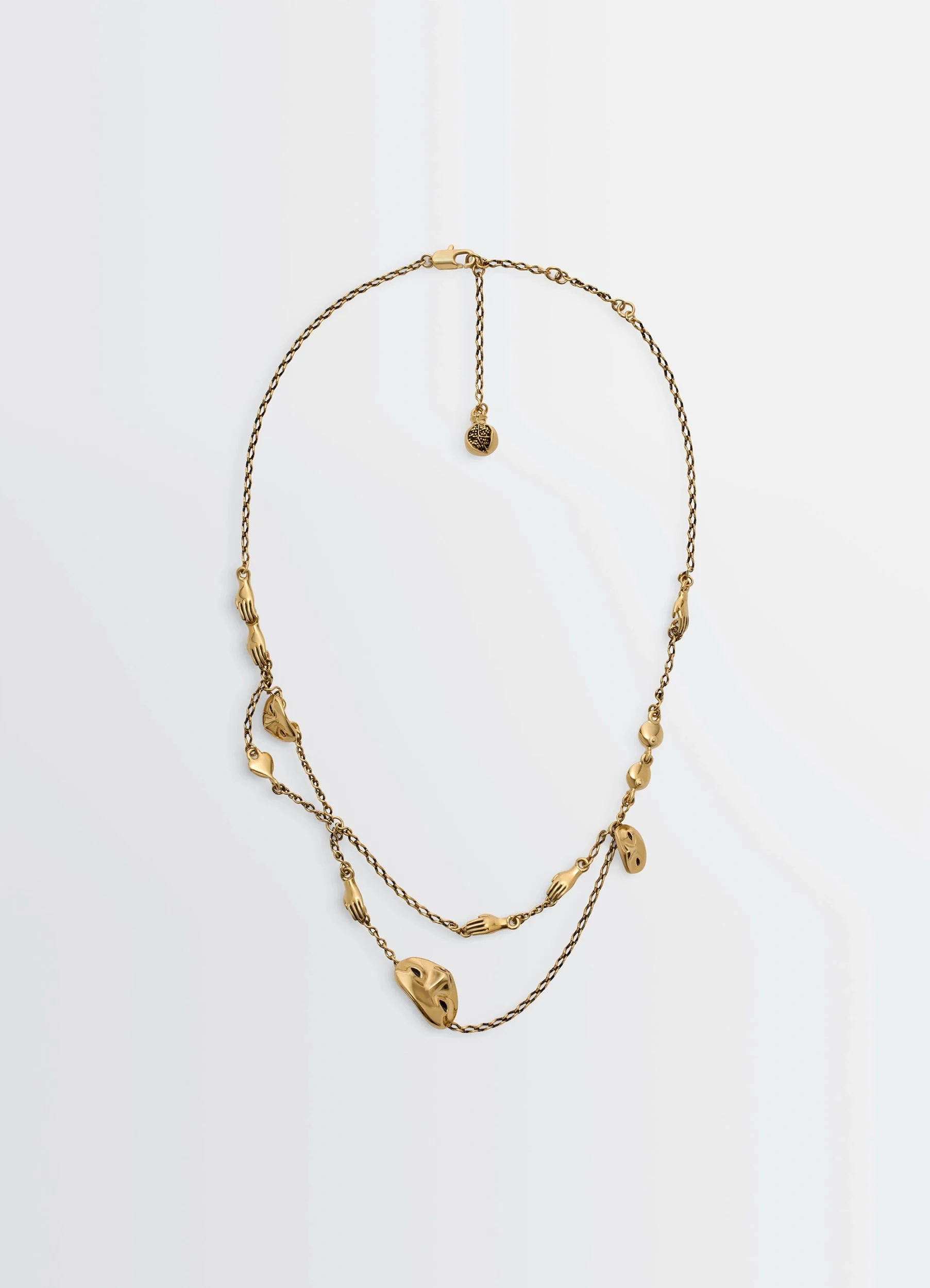 The Estampe necklace is made of brass with an old gold finish. Delicate figurative charms representing a mask, hands, a grenada and a heart are articulated on fine, openplated chains that fall in rows around the neckline. DETAILS Adjustable chain length Lobster clasp closure Width 41 cm First hole 43 cm Second hole 46 cm Made in France Style : JW0019 LO036 FABRICS & CARE Main Material: 100% Brass Be careful not to expose your jewellery to perfumes, detergents, and remove it when exposed to water. To clean and shine them, you can use a soft cloth.