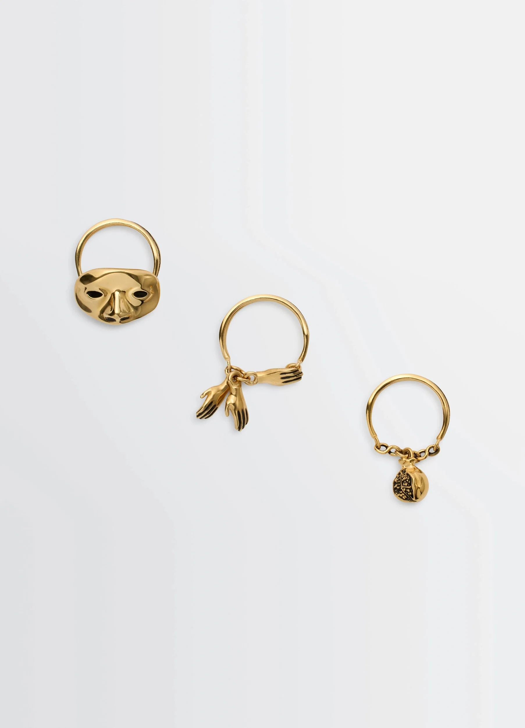 The threering Estampe set is made of brass with an old gold finish. Delicate figurative charms representing a mask, three hands and a heart are set on each band ring. DETAILS Height 2 cm per ring Width 3 cm per ring Made in France Style : JW0018 LO036 FABRICS & CARE Main Material: 100% Brass Be careful not to expose your jewellery to perfumes, detergents, and remove it when exposed to water. To clean and shine them, you can use a soft cloth.