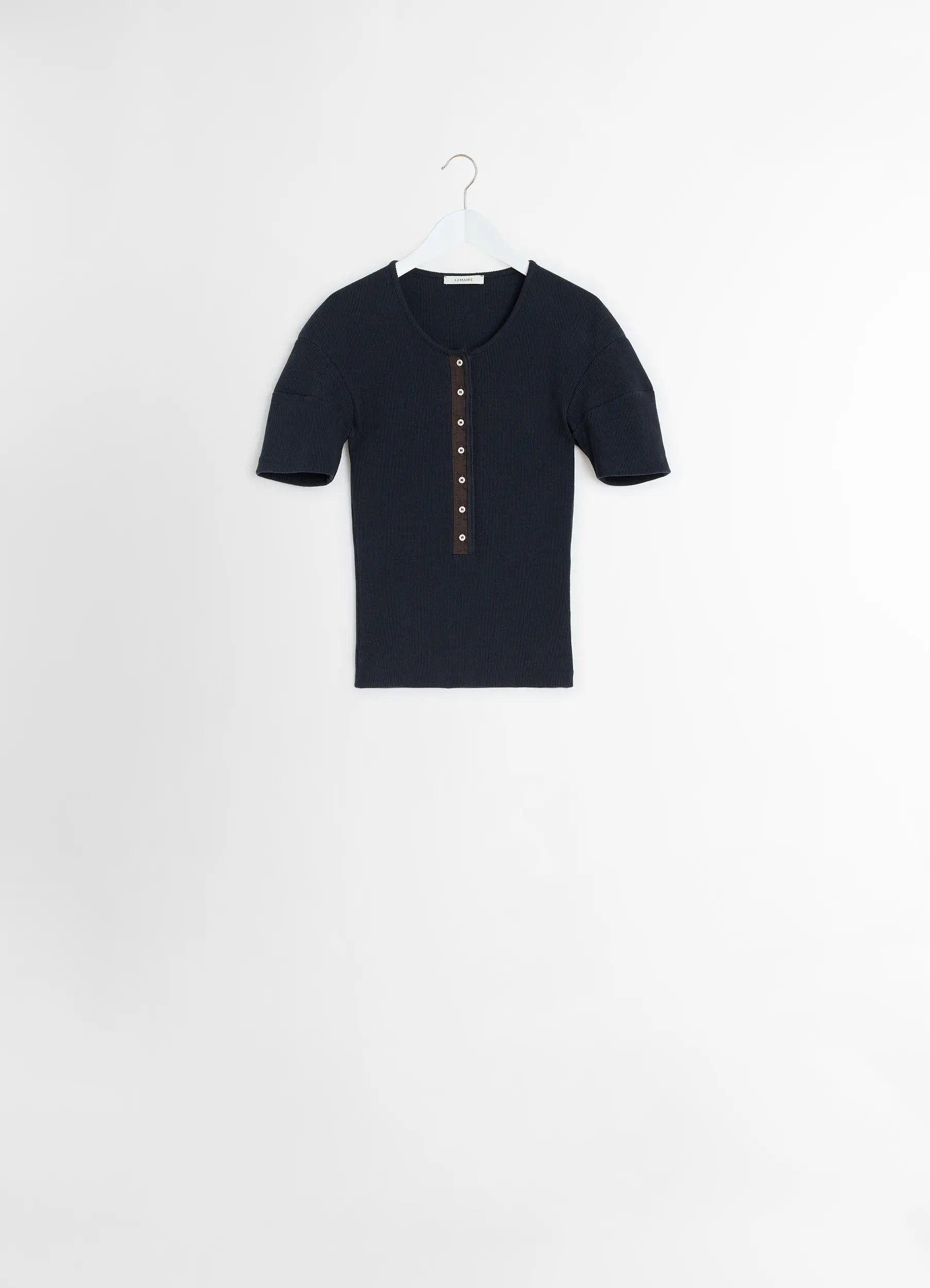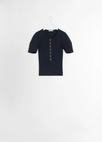 The Cotton Linen Rib Jersey is crafted in cotton lined rib jersey, a light and fluid fabric with a textured rib adding texture to the garment. This body-contouring style features a dropped shoulder design with a central seam, creating an anatomical and sculptural effect. The round neckline is finished with a wider ribbed detail. A contrast fabric runs along the button placket, highlighted by a series of mother-of-pearl buttons. DETAILS Fitted cut Tunisian collar Contrast fabric detail on the buttoning 3D effect shoulder pleats Mother-of-pearl buttons Made in Portugal Style: TO1350 LJ1030 The Model is 179cm / 5'10½" ft and is wearing a size 36 (S). FABRICS & CARE Main Fabric: 69% Cotton, 29% Linen, 2% Elastabe Second Fabric: 100% Cotton Soft wash 30° Do not bleach Do not tumble dry Cool ironing Do not dry clean Dry flat