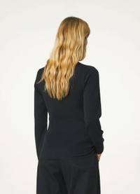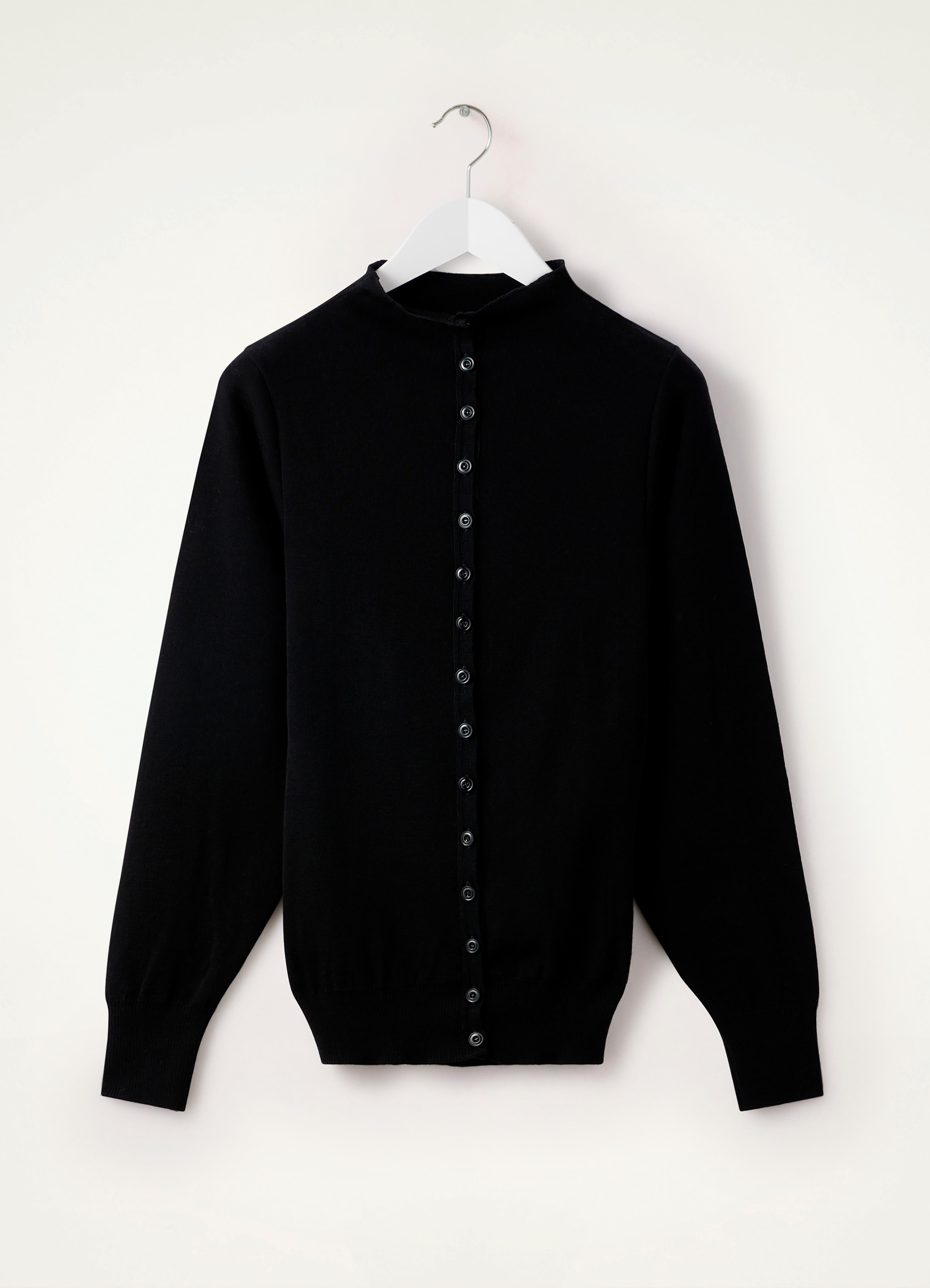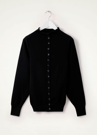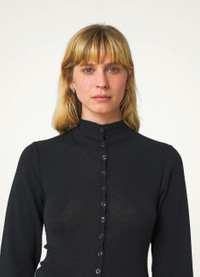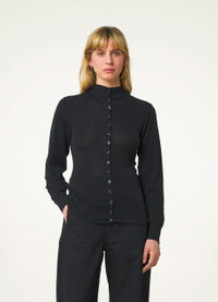 This cardigan is made of fine merino wool with warm, second-skin feel. Its seamless construction extends into a small stand collar, generous sleeves contrasting with its fitted body. Rib finishings on the cuffs and hem create soft gathering around the sleeves and waist. DETAILS Fitted shape Mother-of-pearl buttons Ribbed cuffs and hem Made in France Style : TO1085 LK1011 This model is 180 cm and is wearing a size 36/S FABRICS & CARE Main Fabric : 100% Wool Hand wash Do not bleach Do not tumble dry Cool ironing Soft dry clean Dry flat