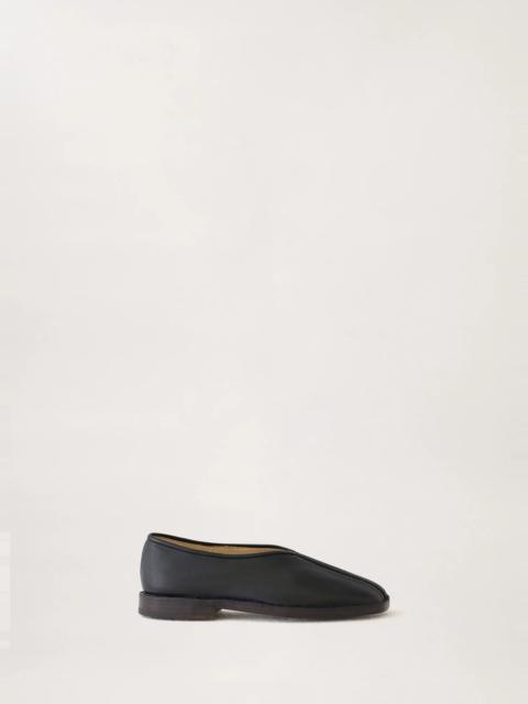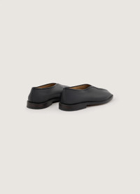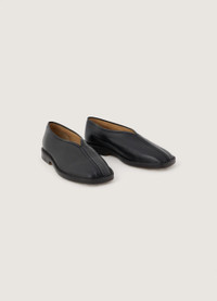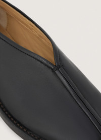 These slippers are made of lamb nappa leather with a shiny finish. This classic LEMAIRE shape has a simple construction composed of two pieces of leather that are sewn together on the front and sealed with leather piping. A square toe and crepe sole add to their flexibility. They feature stitching and piping details. DETAILS Leather lining Stitching details Raw edges 2 cm heel Made in Portugal Style : FO0006 LL0023 FABRICS & CARE Main Material: 100% Lambskin Main Lining: 100% Calf Leather If exposed to water or high humidity, dry your shoes well with an absorbent cloth and let them air dry before storing them. Care: Smooth leather: Use a soft cloth and apply a measured amount of uncolour milk or cream. Suede leather: Brush lightly with a sponge or special suede cloth.