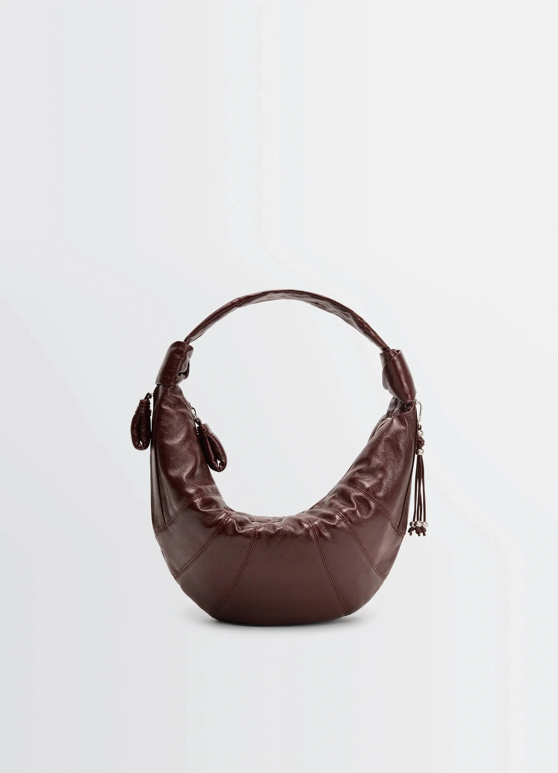 Inspired by the iconic Croissant line, the Fortune Croissant bag introduces a new silhouette for hand and shoulder carry. Its half-moon look is achieved through an assembly of topstitched panels, enriched by knotted elements. To celebrate Valentine's Day, Lemaire revisits the infinity knot - a symbol of prosperity, happiness and longevity - in a charm version that accompanies this bag made from coated cotton canvas with GOTS-certified yarns, with a textured, shiny appearance. Inspired by the iconic Croissant line, the Fortune Croissant bag introduces a new silhouette for hand and shoulder carry. Its half-moon look is achieved through an assembly of topstitched panels, enriched by knotted elements. To celebrate Valentine's Day, Lemaire revisits the infinity knot - a symbol of prosperity, happiness and longevity - in a charm version that accompanies this bag made from coated cotton canvas with GOTS-certified yarns, with a textured, shiny appearance. DETAILS Fortune Croissant bag in coated cotton Soft model with stitched panels Hand and shoulder carry Handle with knot detailing Silver-plated side ring with removable charm with carabiner’s clasp Knotted charm in coated cotton with infinity knot and metal beads Zipped side pocket with quilted pull tab Zipper closure with quilted pull tab Cotton canvas lining and inside card pocket Lemaire embossed apple leather inside label Silver-plated metalwork Dimensions: Arrow height: Made in Italy Style : BG0185 LF1329 Fortune Croissant bag in coated cotton Soft model with stitched panels Hand and shoulder carry Handle with knot detailing Silver-plated side ring with removable charm with carabiner’s clasp Knotted charm in coated cotton with infinity knot and metal beads Zipped side pocket with quilted pull tab Zipper closure with quilted pull tab Cotton canvas lining and inside card pocket Lemaire embossed apple leather inside label Silver-plated metalwork Dimensions: Arrow height: Made in Italy Style : BG0185 LF1329 CARE Main fabric: 100% Cotton Main lining: 100% Cotton Main fabric: 100% Cotton Main lining: 100% Cotton