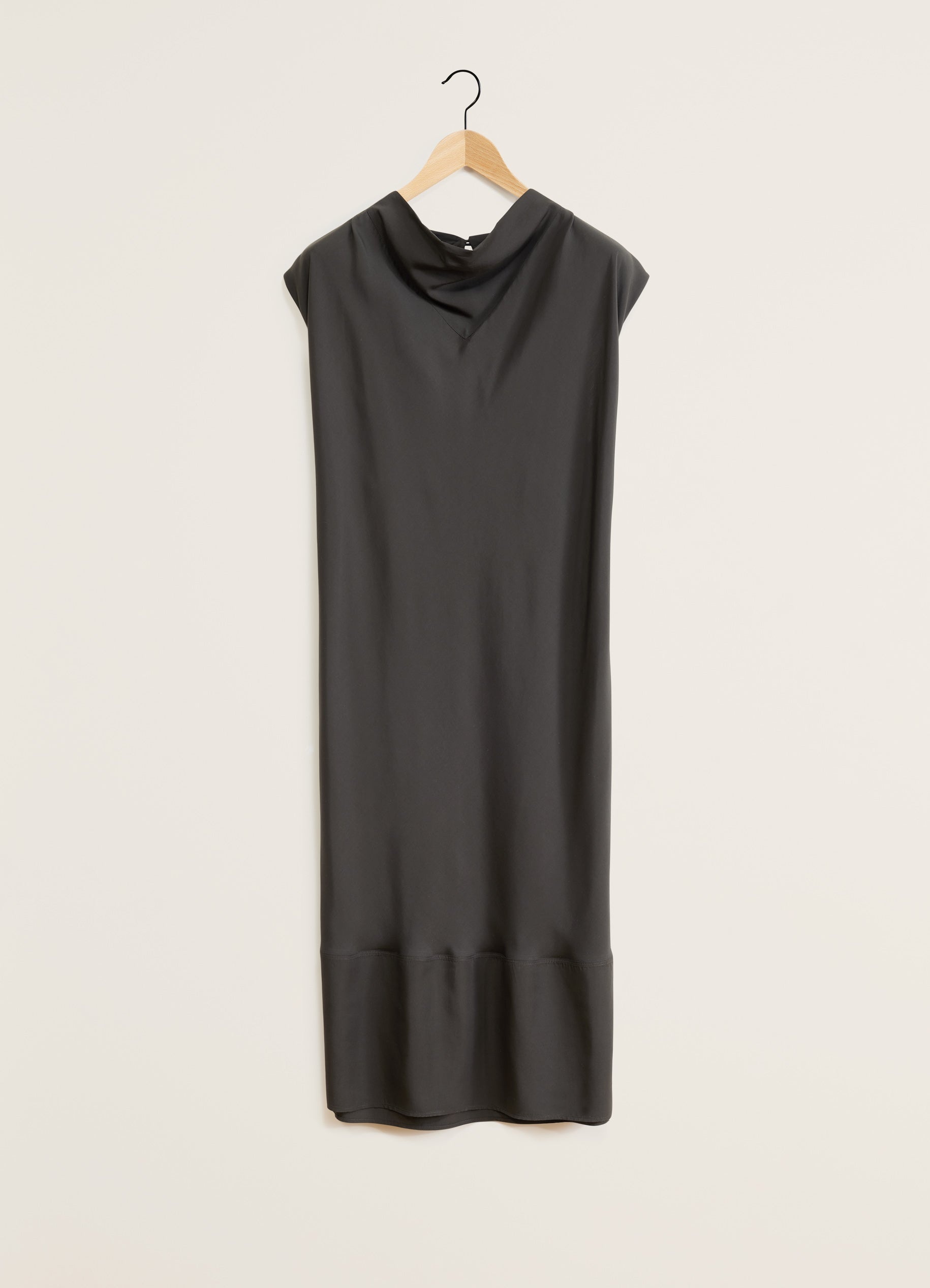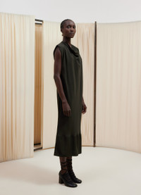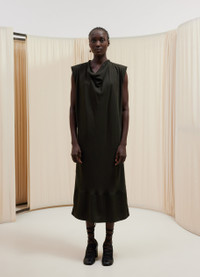 This dress is a new addition to LEMAIRE’s wardrobe. It is made of lyocell with a soft sheen and a fluid drape. The fabric has been bias-cut to bring specific movements to the garment when worn. Its straight fit follows the lines of the body. A triangular, almost cowl-shaped collar imitates a foulard. The dress also features turned up and stitched sleeves as well as a slit at the back with a button. DETAILS Straight fit Below-the-knee length Scarf collar with a triangle shape Turned up and stitched sleeves Draped effect Flap at the bottom Made in Italy Style: DR1055 LF1126 FABRICS & CARE Main Material: 100% Lyocell Soft wash 30° Do not bleach Do not tumble dry Cool ironing Soft dry clean
