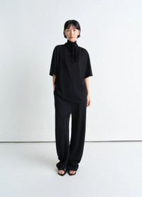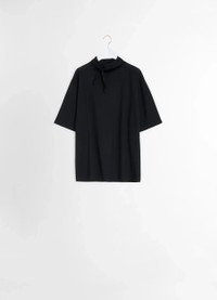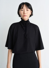 This is a classic summery LEMAIRE wardrobe staple. It is made in light and fluid cotton jersey that has been mercerised, granting a silky shine to the style. The Foulard T-shirt boasts a boxy fit and a stand collar with V-shape base that extends into a scarf. One can tie it on either side of the neck or fall on the front. DETAILS Boxy fit Short sleeves Scarf attached to the stand collar Stitching details at the hem and neck Made in Portugal Style: TO1384 LJ1018 FABRICS & CARE Main Fabric: 100% Cotton Soft wash 30° Do not bleach Do not tumble dry Cool ironing Do not dry clean Dry flat