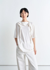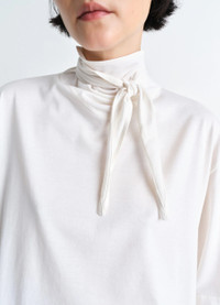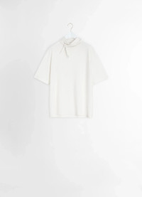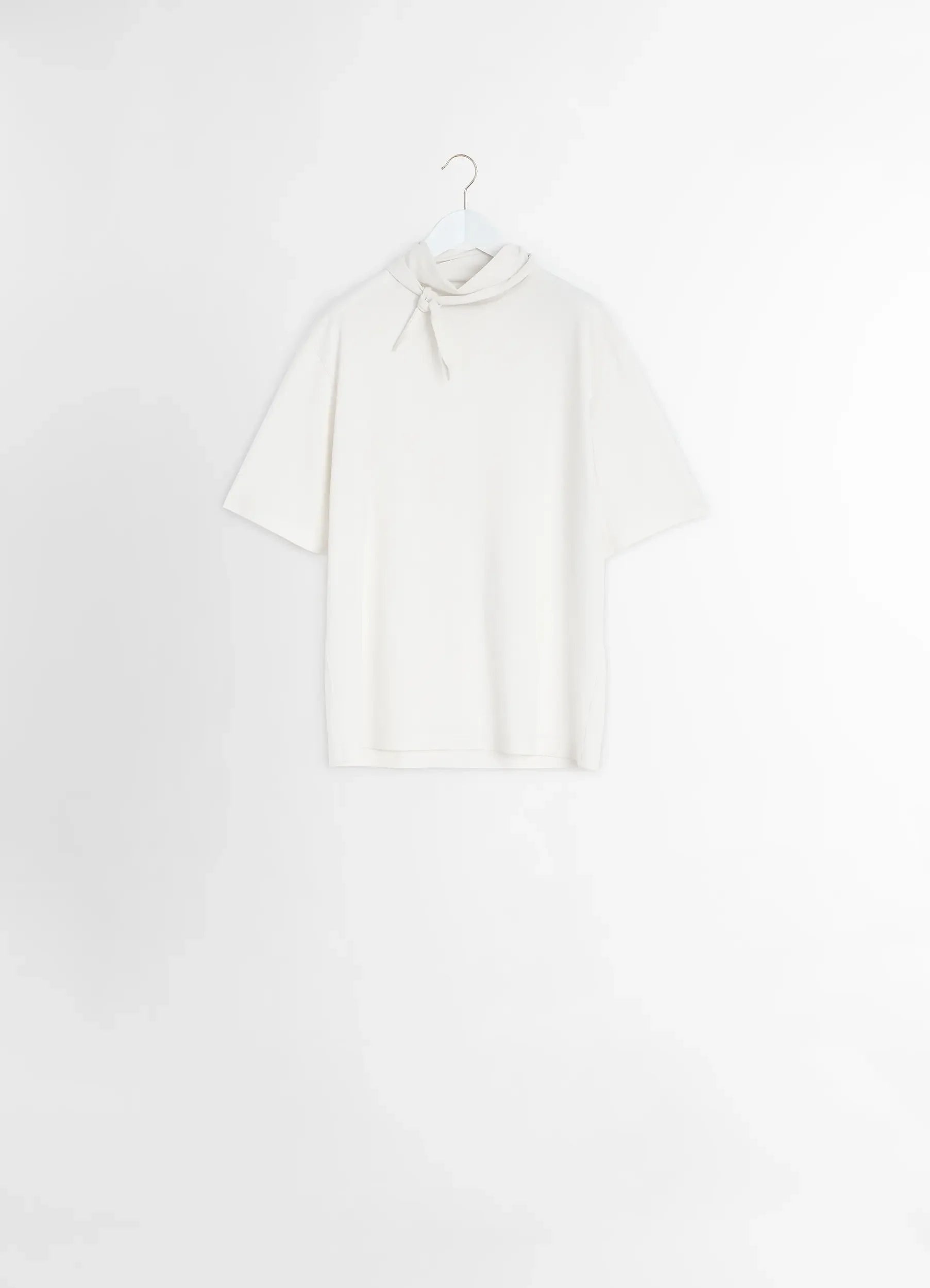 This is a classic summery LEMAIRE wardrobe staple. It is made in light and fluid cotton jersey that has been mercerised, granting a silky shine to the style. The Foulard T-shirt boasts a boxy fit and a stand collar with V-shape base that extends into a scarf. One can tie it on either side of the neck or fall on the front. DETAILS Boxy fit Short sleeves Scarf attached to the stand collar Stitching details at the hem and neck Made in Portugal Style: TO1384 LJ1018 FABRICS & CARE Main Fabric: 100% Cotton Soft wash 30° Do not bleach Do not tumble dry Cool ironing Do not dry clean Dry flat
