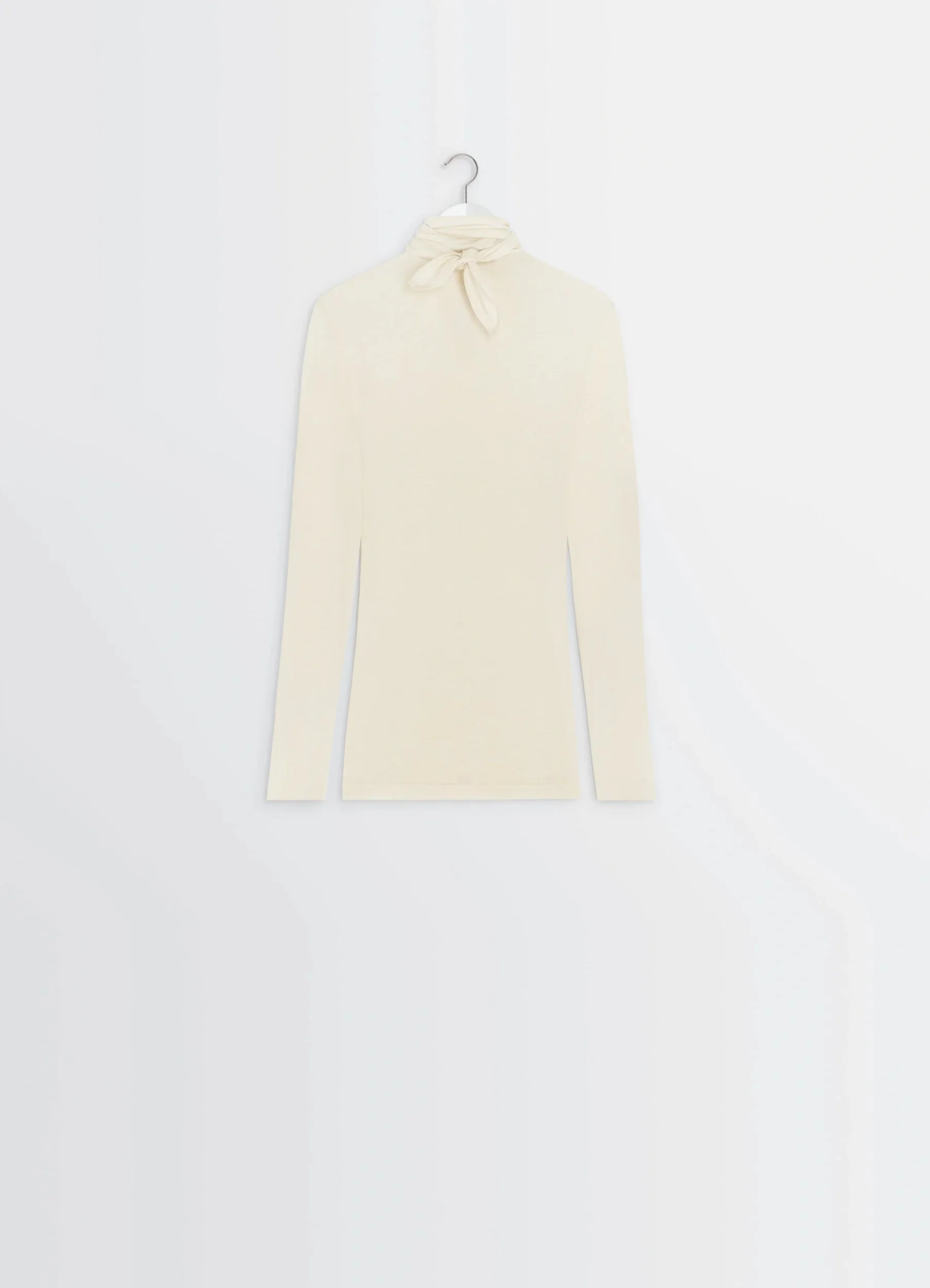 This long-sleeved top completes Lemaire's women's wardrobe, featuring a scarf that can be tied or left loose for a casual yet elegant look. It's crafted in lightweight viscose and silk-blend jersey with a soft, smooth feel. DETAILS Scarf top with panels in light viscose and silk jersey Fitted cut Integrated scarf at the front Long sleeves with tone-on-tone cotton panels Opening at the back neckline Scarf trim with bias in tone-on-tone cotton Made in Portugal Style : TO1469 LJ1039 The model is 177 cm tall and is wearing a size 36 (S). FABRICS & CARE Main Material: 85% Viscose 15% Silk Second Material: 100% Cotton
