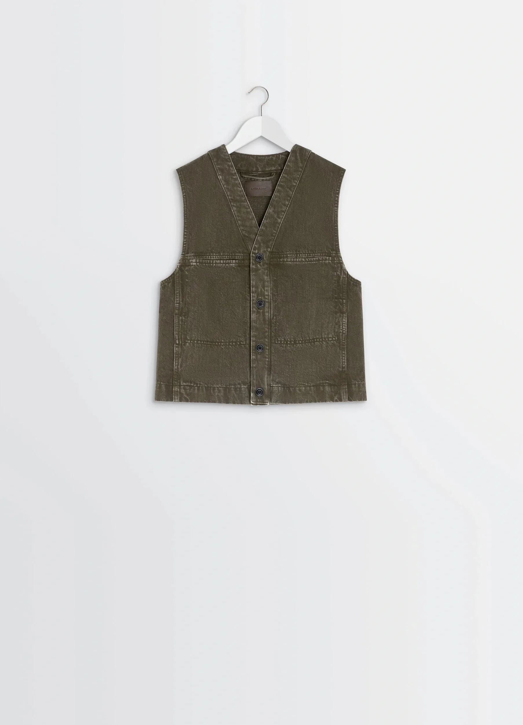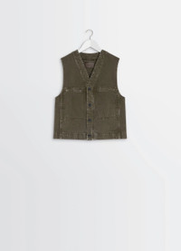 This pocket gilet is in keeping with Lemaire's utilitarian aesthetic. It is made from a thick denim that has been garment-dyed to give it a snowy patina. DETAILS Gilet in garment-dyed denim with a snow wash Straight cut V-neck Front button closure Chest pockets and side pockets Interior Lemaire embossed leather label Made in Morocco Style : OW1196 LD1062 The model is 177 cm tall and is wearing a size 36 (S). FABRICS & CARE Main Material: 100% Cotton Main Lining: 100% Cotton Jacron: 100% Cow Leather
