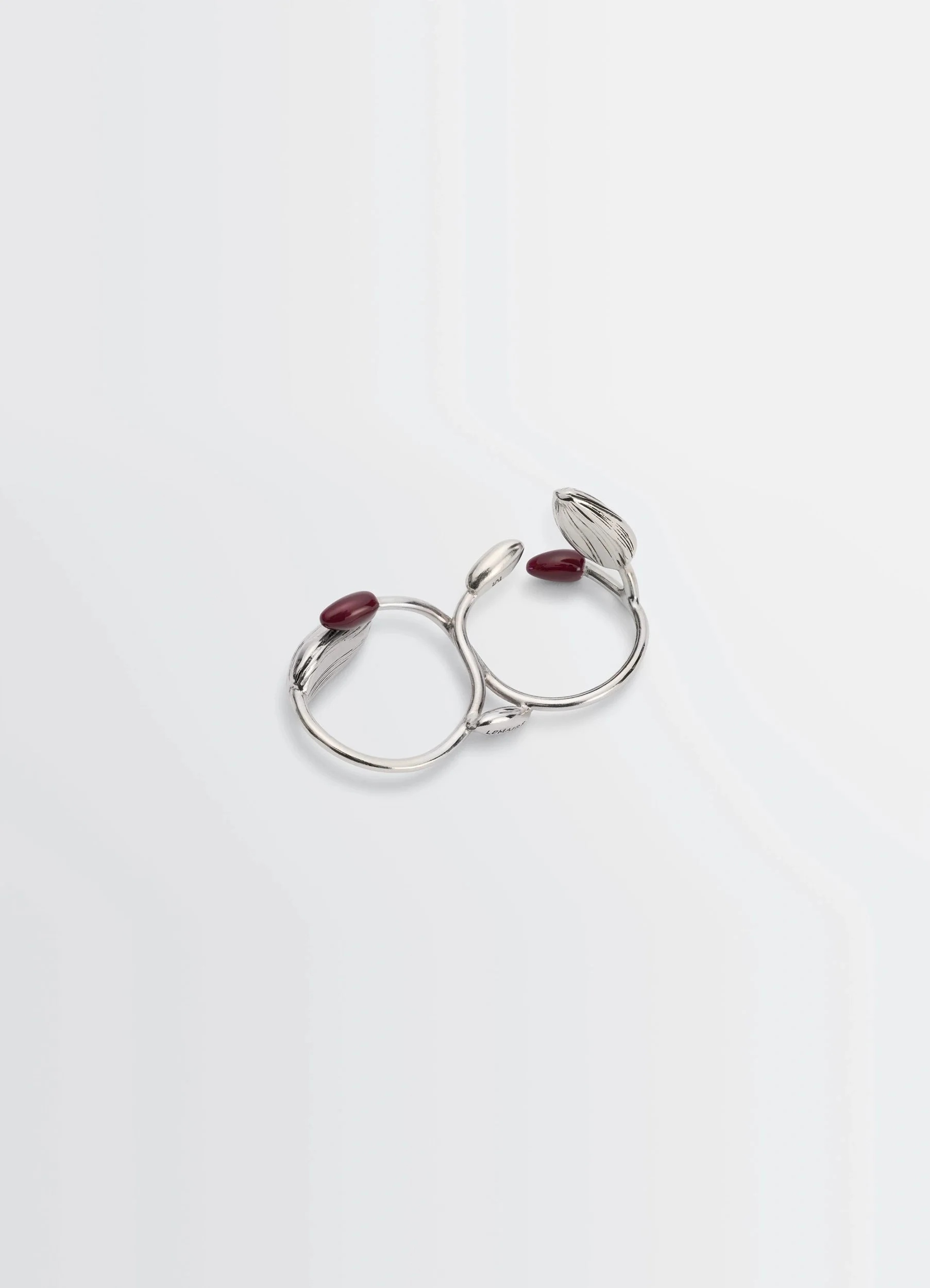 The Girasol Double ring is made of brass with a silver finish and two-tone enamel highlights. Inspired by the shape of sunflower seeds, this sculptural double-ring is accented by red and black enamel pips. Its open shape can be adapted to the finger’s width. DETAILS Adjustable width Two-tone enamel pips Width 3 cm Made in Portugal Style: JW0026 LO036 FABRICS & CARE Main Material: 100% Brass Second Material: 100% Epoxy resine