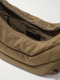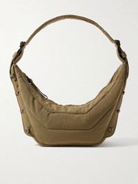 LEMAIRE's shoulder bag draws on the label's signature ‘Croissant’ style, only this version is slouchier, padded for structure and given a practical water-repellent finish. It’s made from garment-dyed recycled canvas and has lace-up sides and an adjustable shoulder strap. It’s sized to fit your phone, paperback and wallet. Lower-Impact Materials. This product is made using at least 50% lower-impact materials or ingredients. Find out more about our NET SUSTAIN criteria here. Details & Care - Army-green recycled canvas - Adjustable shoulder strap - Internal zipped pocket - Fully lined - Zip fastening along top - Designer color: Dark tobacco
