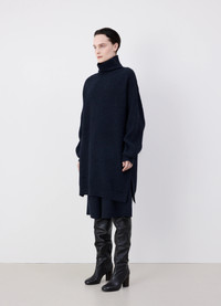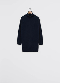 This short, ribbed LEMAIRE dress is crafted in a soft Shetland wool with a very soft and fluid hand. It has a high collar with no seams which drapes comfortably at the front neck. There is a flexible rib at the hem and the cuffs of the generous sleeves. On each side of the hem, the dress features slits at mid-thigh level for extra ease. DETAILS - Relaxed fit - High neck - Slitted hem - Ribbed cuffs Made in Italy Style: DR1089 LK1027 FABRICS & CARE Main Fabric: 100% Wool Hand wash Do not bleach Do not tumble dry Cool ironing Soft dry clean Dry flat
