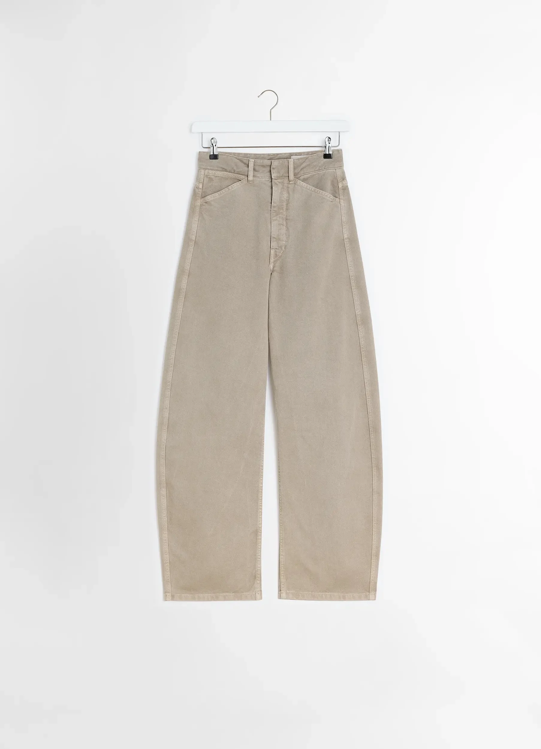 These High Waisted Curved Pants are a classic shape in LEMAIRE's vestiaire. They are made in garment dyed snow heavy denim, a classic LEMAIRE fabric with a thick, round hand that has been pigment dyed to evoke a snowy surface. They are high-waisted with a concealed closure, and have long, straight legs with slightly twisted side seams. They feature classic denim details such as five pockets and contrast stitching. DETAILS - Straight fit - High-rise - Hidden hook and button closure - Zip fly - Belt loops - Two slanted side pockets - Two back patch pockets - Contrast stitching Made in Morocco Style: PA1052 LD1042 The Model is 179cm / 5'10½" ft and is wearing a size 36 (S). FABRICS & CARE Main Fabric: 100% Cotton Main Lining: 100% Cotton Soft wash 30° Do not bleach Do not tumble dry Cool ironing Soft dry clean Wash upside down