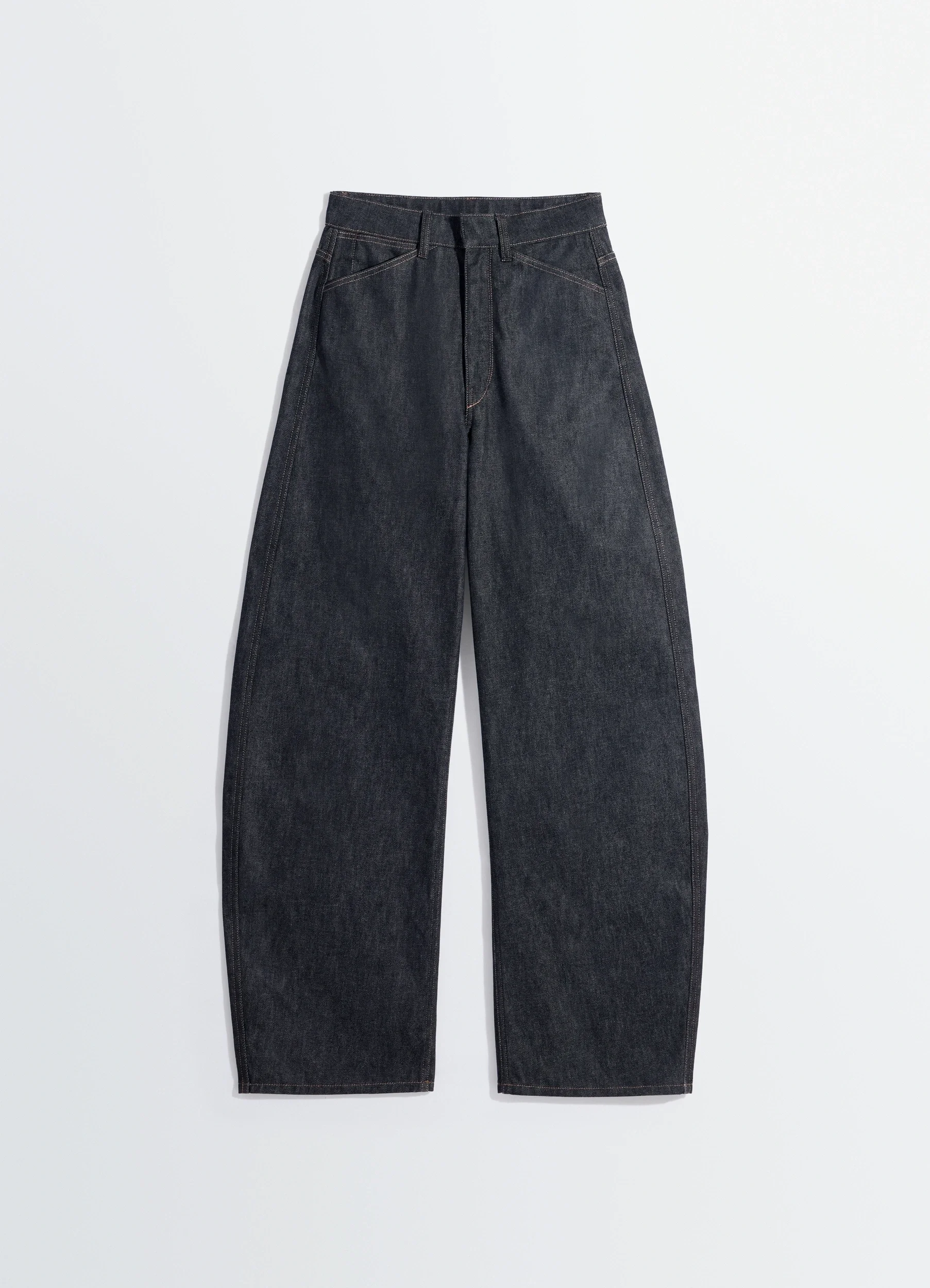 These high-waisted rounded trousers reflect LEMAIRE’s taste for reinterpreting workwear pieces. This wardrobe essential is crafted from thick slate denim. The model is 187 cm tall and wears a size 48 (M). These high-waisted rounded trousers reflect LEMAIRE’s taste for reinterpreting workwear pieces. This wardrobe essential is crafted from thick slate denim. The model is 187 cm tall and wears a size 48 (M). DETAILS Rounded high-waist trousers in thick slate denim Wide fit Waistband with belt loops Concealed fly Side slant pockets Back patch pockets Contrasting topstitching LEMAIRE embossed leather patch at back Made in Italy Style: PA1264 LD1061 Rounded high-waist trousers in thick slate denim Wide fit Waistband with belt loops Concealed fly Side slant pockets Back patch pockets Contrasting topstitching LEMAIRE embossed leather patch at back Made in Italy Style: PA1264 LD1061 CARE Main fabric: 100% cotton Jacron patch: 100% cow leather Soft wash 30° Do not bleach Do not tumble dry Cool ironing Soft dry clean Wash upside down Main fabric: 100% cotton Jacron patch: 100% cow leather Soft wash 30° Do not bleach Do not tumble dry Cool ironing Soft dry clean Wash upside down