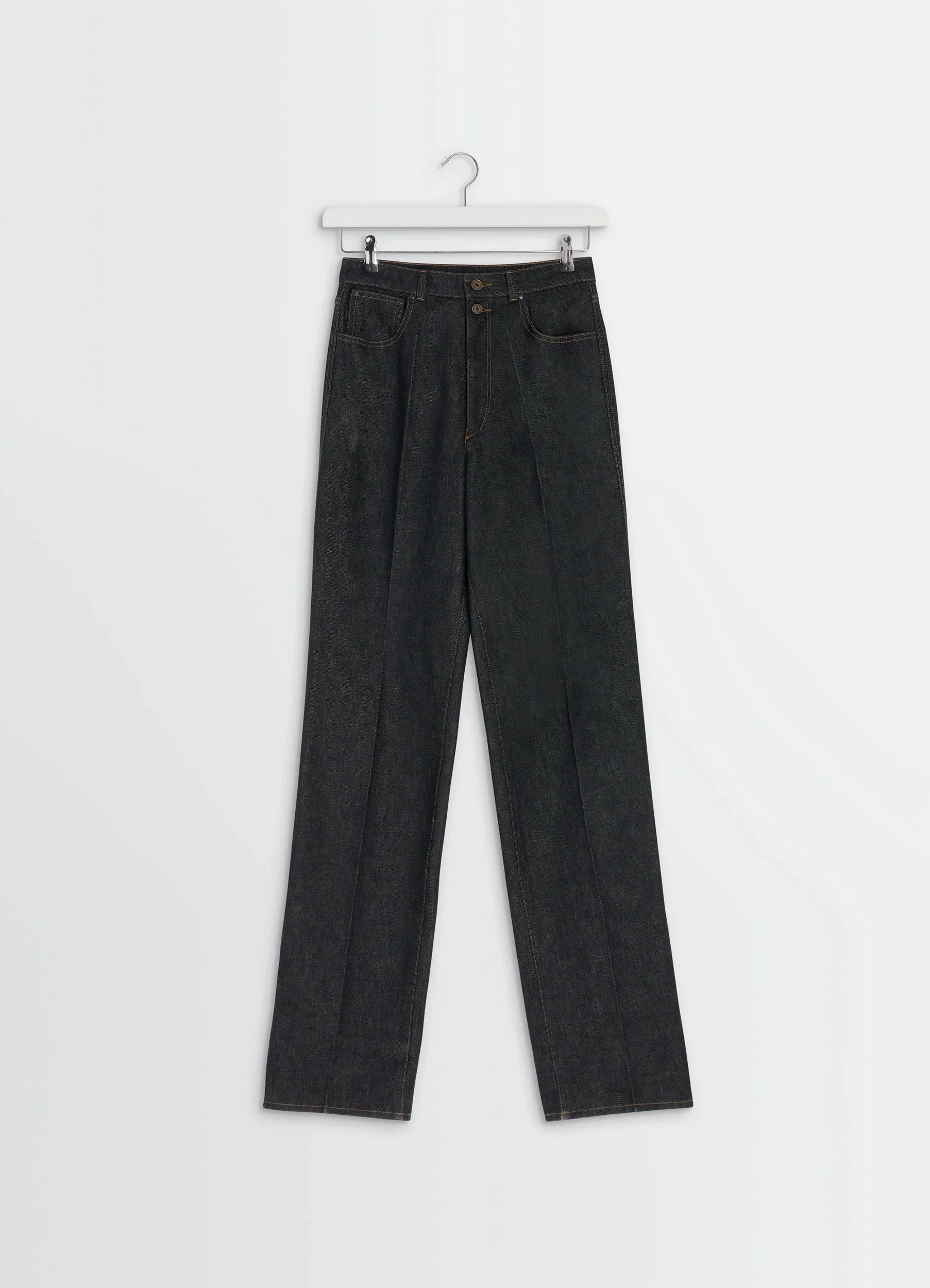 These high-waisted pants are a new essential in the Lemaire wardrobe, with their straight cut and pronounced front pleats. Crafted in thick yarn-dyed slate denim with a raw hand, which adds a sophisticated touch to the silhouette. DETAILS High waisted straight pants in yarn-dyed heavy slate denim Straight cut Belt loops at the waistband Button closure with hidden zipper Ornamental metal buttons Metal rivets Western pockets with a ticket pocket Back patch pockets Lemaire embossed leather jacron at the back Distinct front and black pleats Contrast topstitching Made in Italy Style : PA1229 LD1061 The model is 177 cm and is wearing a size 36 (S). FABRICS & CARE Main Material: 100% Cotton Main Lining: 65% Polyester 35% Cotton Jacron: 100% Cow Leather