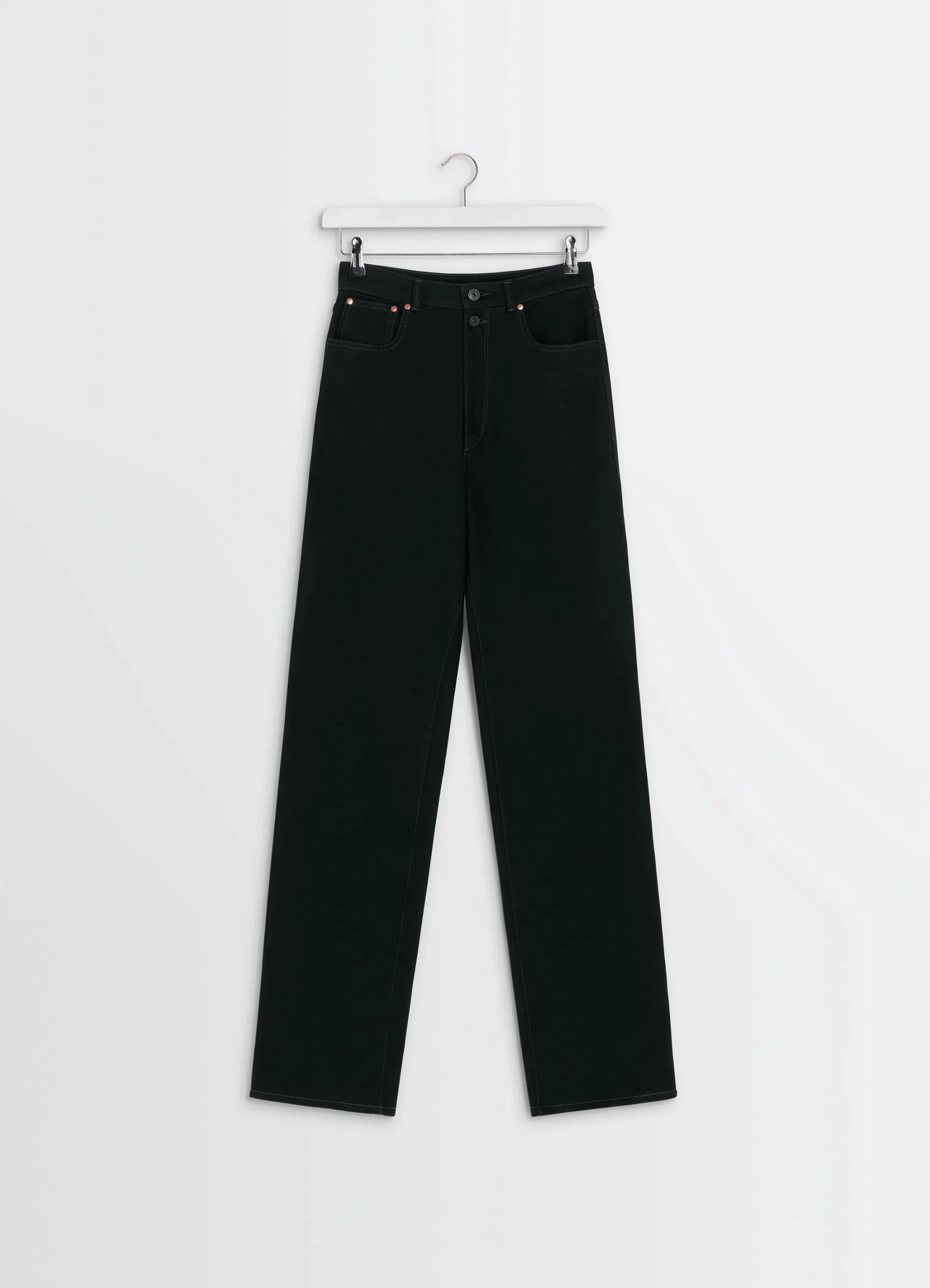 These high-waisted pants are a new essential in the Lemaire wardrobe, with their straight cut and pronounced front pleats. They are made from Lemaire's signature thick denim in a deep black wash. The model is 177 cm and is wearing a size 36 (S). DETAILS High waisted straight pants in heavy black denim Belt loops at the waistband Button closure with hidden zipper Ornamental metal buttons Western pockets with a ticket pocket Back patch pockets Copper-toned metal rivets Lemaire embossed leather jacron at the back Straight cut Distinct front and black pleats Contrast topstitching Made in Morocco Style : PA1229 LD1055 CARE Main Material: 100% Cotton Main Lining: 100% Cotton Jacron: 100% Cow Leather Soft wash 30° Do not bleach Do not tumble dry Cool ironing Soft dry clean Wash upside down