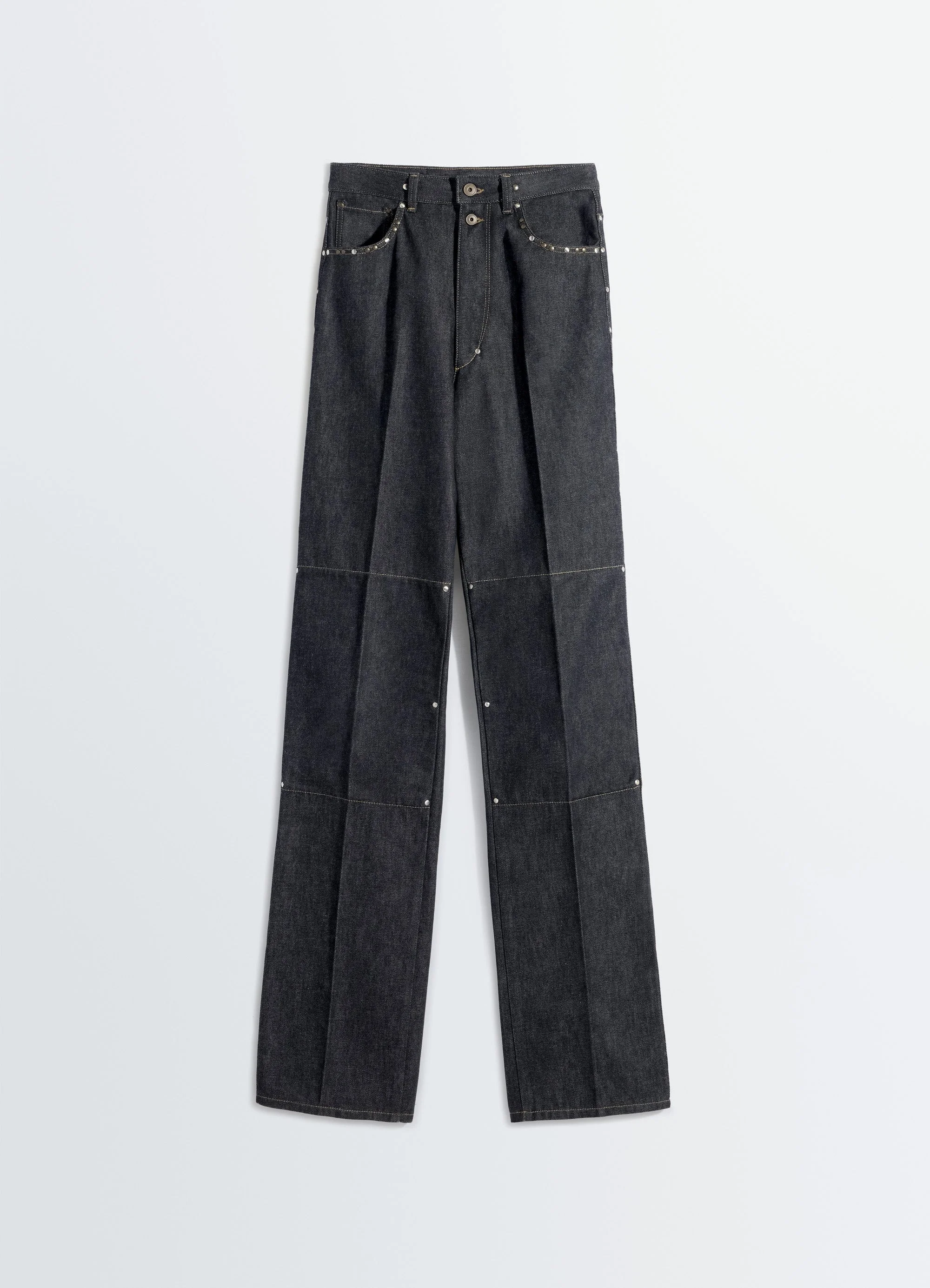 These straight high-waisted trousers reflect LEMAIRE’s attraction to reinterpreting archetypal pieces. Made from thick slate denim, the model features rivets in varying sizes and a refined finish. The model is 177 cm tall and wears a size 36 (S). These straight high-waisted trousers reflect LEMAIRE’s attraction to reinterpreting archetypal pieces. Made from thick slate denim, the model features rivets in varying sizes and a refined finish. The model is 177 cm tall and wears a size 36 (S). DETAILS High-waist straight trousers with rivets in thick slate denim Straight cut Two visible metal buttons at waistband Front riveted pockets with coin pocket Back patch pockets LEMAIRE embossed leather patch at back Made in Italy Style: PA1303 LD1061 High-waist straight trousers with rivets in thick slate denim Straight cut Two visible metal buttons at waistband Front riveted pockets with coin pocket Back patch pockets LEMAIRE embossed leather patch at back Made in Italy Style: PA1303 LD1061 CARE Main fabric: 100% cotton Jacron patch: 100% cow leather Do not wash Do not bleach Do not tumble dry Cool ironing Soft dry clean Main fabric: 100% cotton Jacron patch: 100% cow leather Do not wash Do not bleach Do not tumble dry Cool ironing Soft dry clean